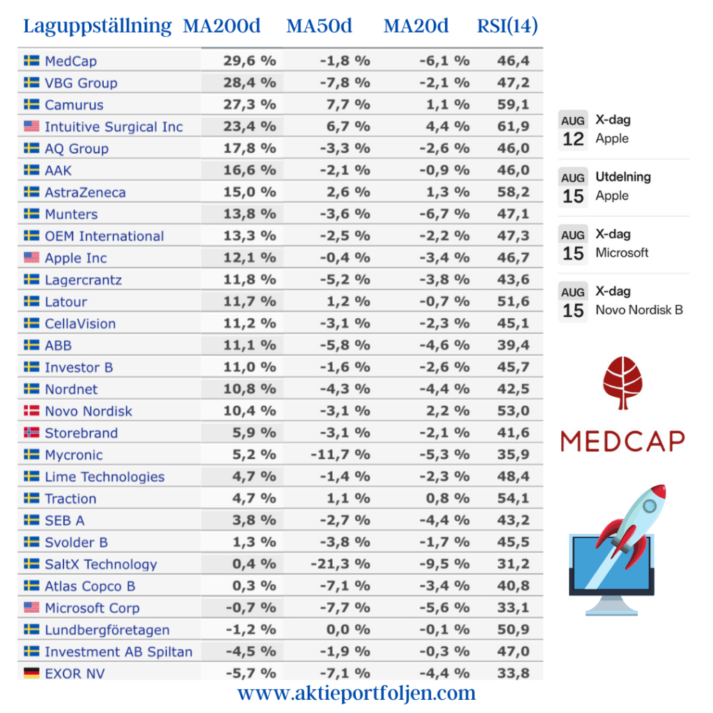 Tyvärr rapportrasade laguppställningens läkemedelsjätte Novo Nordisk med -6,7% efter att ha redovisat lägre resultat och intäkter än väntat. Aktien trendar nu på sin egen MA200-linje. Jag bevakar ett eventuellt påfyllningsläge under förutsättning att trenden inte försämras ytterligare.
