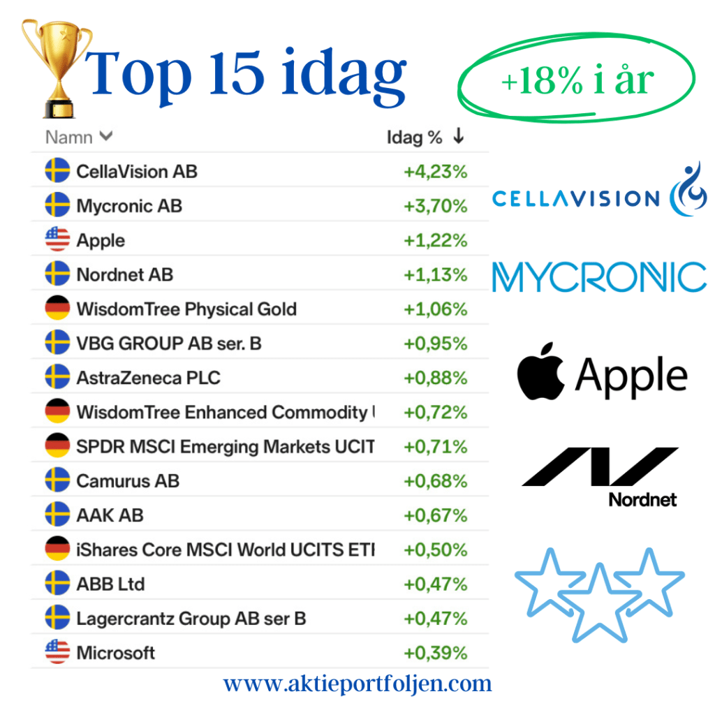 Vi lämnade Stockholm igår och på vår resa söderut stannar vi nu till i vackra Kalmar. Laguppställningen stängde på ett tydligt plus och en bit över Stockholmsindexen som stängde omkring nollan. Det blev en ganska spretig stängning i hela Europa inför onsdagens inflationsutfall. Dagens toppkvartett gick bra utan direkta nyheter. Ledartröjan gick till blodanalysbolaget Cellavision följd av mönsterritarbolaget Mycronic, techjätten Apple (vid kl 17:40) och nätmäklaren Nordnet. Jag fortsatte fylla på i VBG, OEM och Lagercrantz. Jag fyllde även på i etf:erna Emerging Markets och Eurostoxx 50.