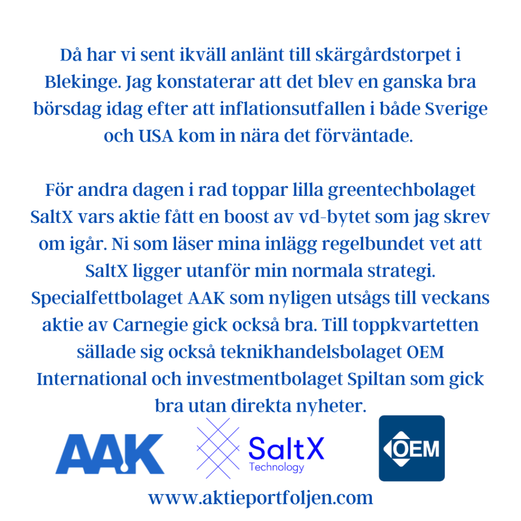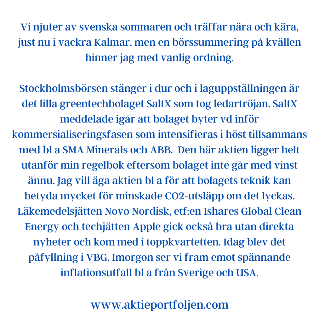 Stockholmsbörsen stänger i dur och i laguppställningen är det lilla greentechbolaget SaltX som tog ledartröjan. SaltX meddelade igår att bolaget byter vd inför kommersialiseringsfasen som intensifieras i höst tillsammans med bl a SMA Minerals och ABB. Den här aktien ligger helt utanför min regelbok eftersom bolaget inte går med vinst ännu. Jag vill äga aktien bl a för att bolagets teknik kan betyda mycket för minskade CO2-utsläpp om det lyckas. Läkemedelsjätten Novo Nordisk, etf:en Ishares Global Clean Energy och techjätten Apple gick också bra utan direkta nyheter och kom med i toppkvartetten. Idag blev det påfyllning i VBG. Imorgon ser vi fram emot spännande inflationsutfall bl a från Sverige och USA.