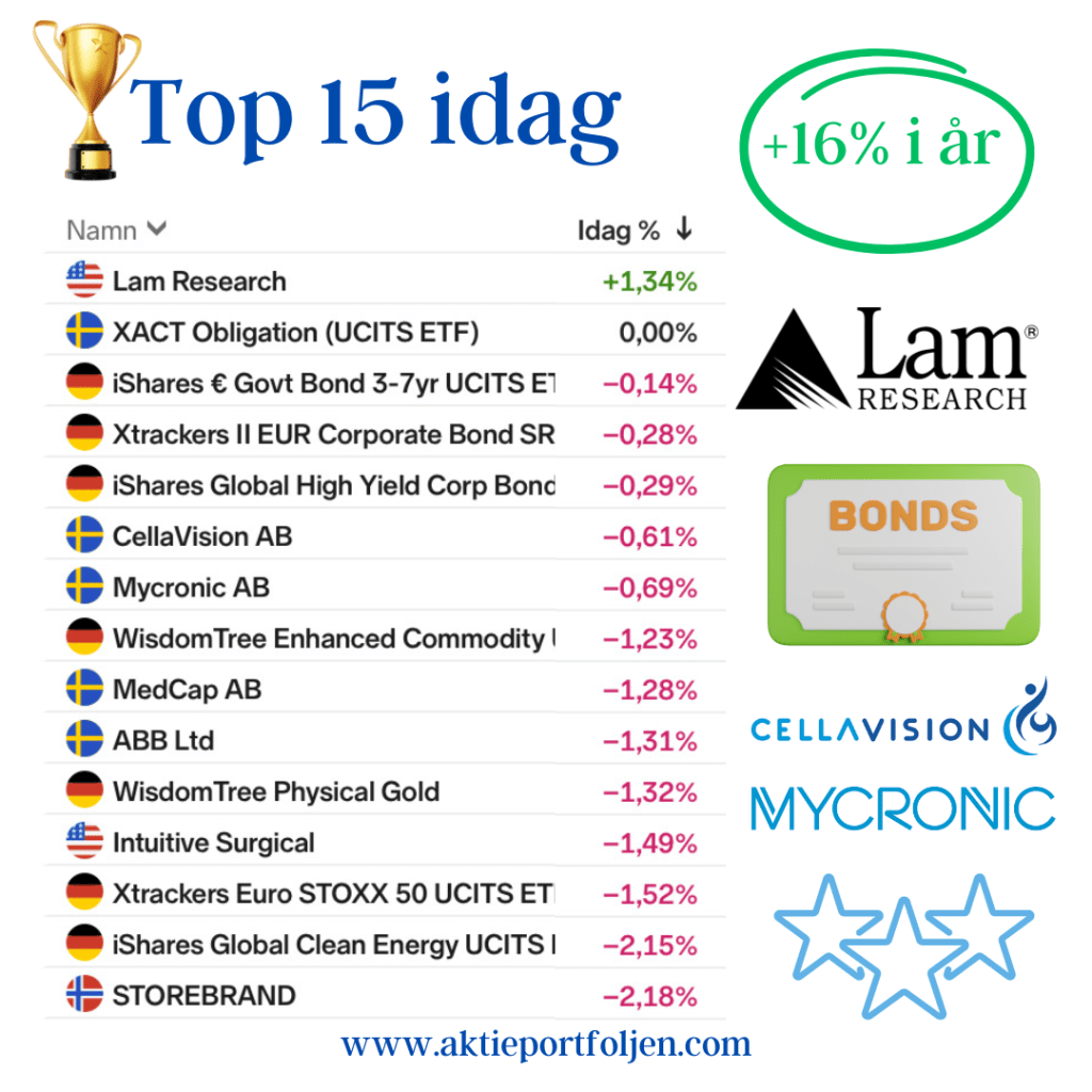 Laguppställningens uppgång i år har nu fallit ned till +16%, vilket trots allt är en bra utveckling. Börsen ger och tar och nu ser jag fram emot fortsättningen.