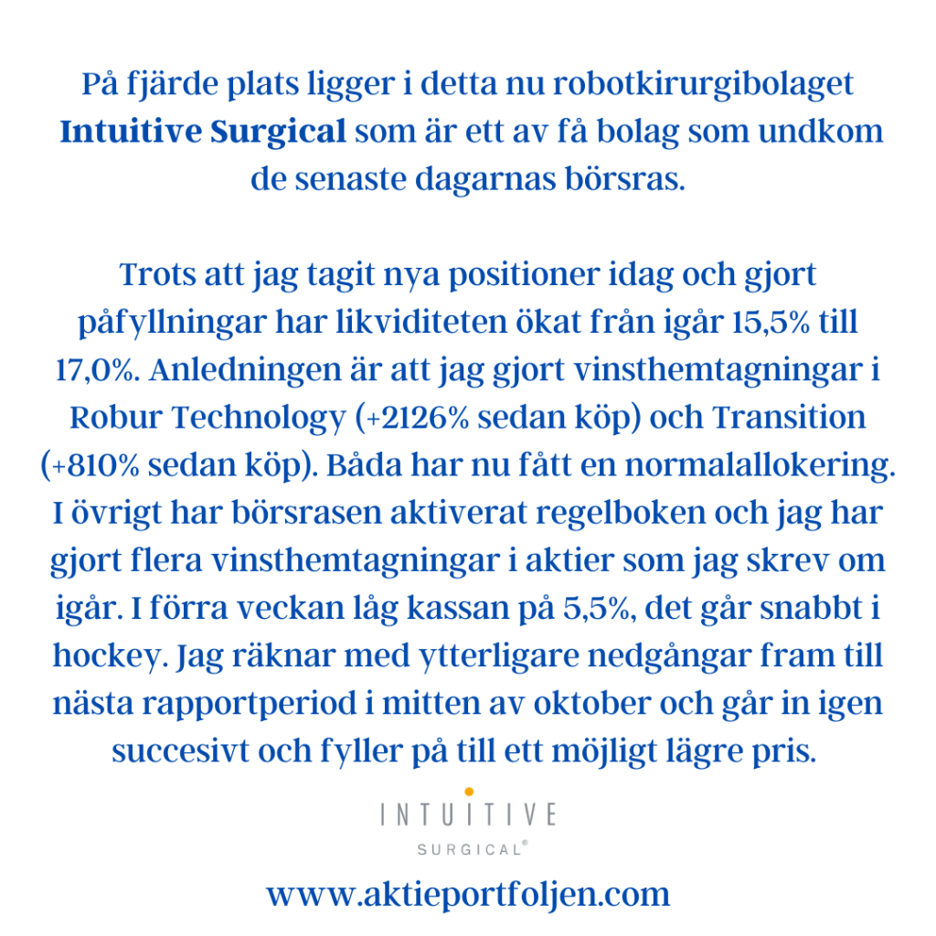 Trots att jag tagit nya positioner idag och gjort påfyllningar har likviditeten ökat från igår 15,5% till 17,0%. Anledningen är att jag gjort vinsthemtagningar i Robur Technology (+2126% sedan köp) och Transition (+810% sedan köp). Båda har nu fått en normalallokering. I övrigt har börsrasen aktiverat regelboken och jag har gjort flera vinsthemtagningar i aktier som jag skrev om igår. I förra veckan låg kassan på 5,5%, det går snabbt i hockey. Jag räknar med ytterligare nedgångar fram till nästa rapportperiod i mitten av oktober och går in igen succesivt och fyller på till ett möjligt lägre pris.