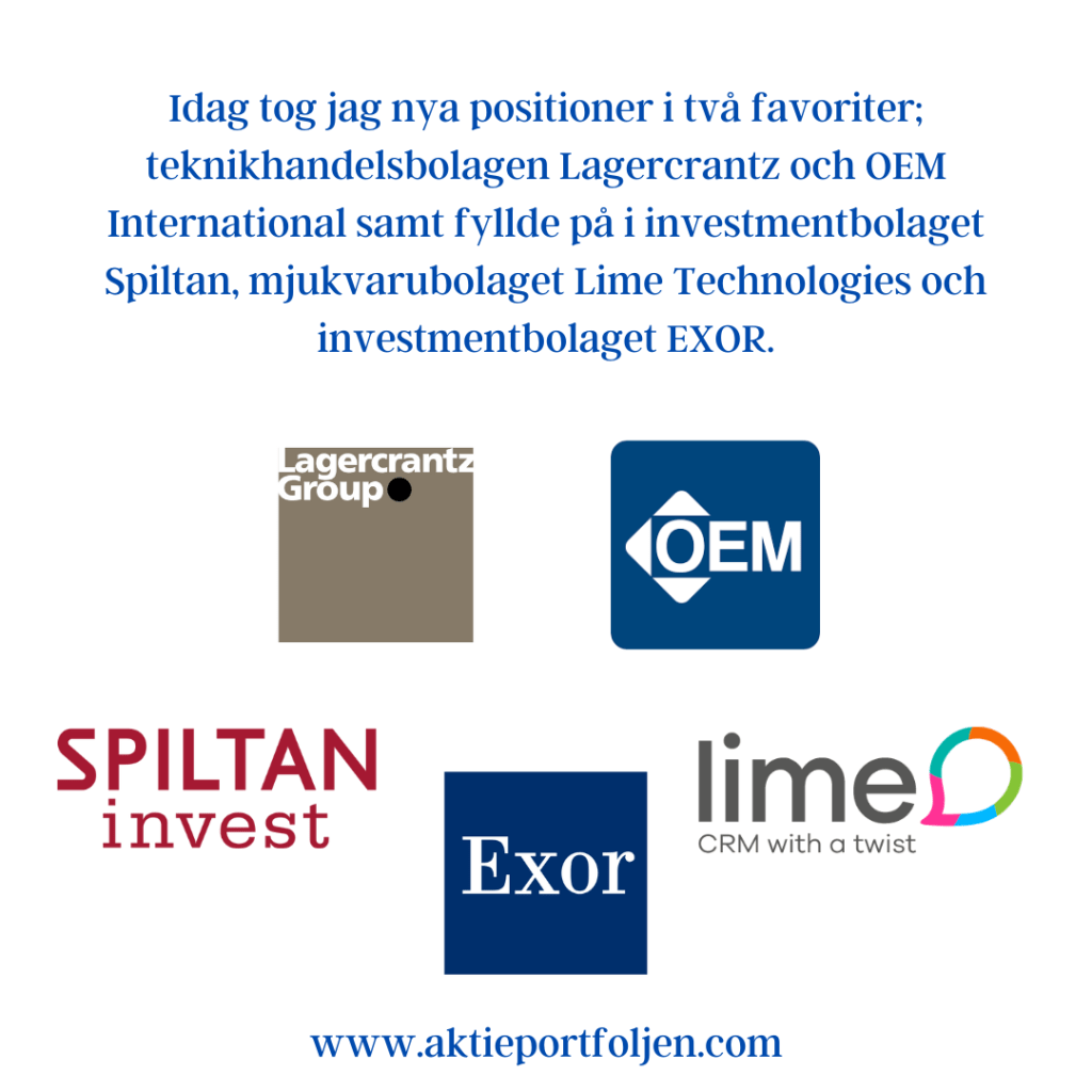 Idag tog jag nya positioner i två favoriter; teknikhandelsbolagen Lagercrantz och OEM International samt fyllde på i investmentbolaget Spiltan, mjukvarubolaget Lime Technologies och investmentbolaget EXOR.