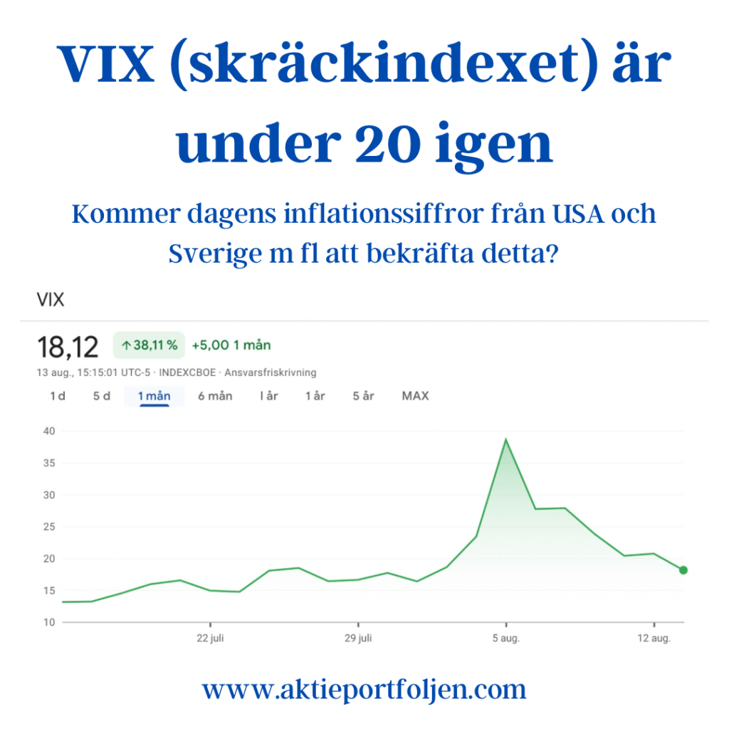 När amerikanska inköpschefsindex blev sämre än väntat och arbetslösheten kom in högre ökade marknadens rädsla för lågkonjuktur. Samtidigt som japanska börsen dök i måndags med 10% stack VIX-indexet iväg till över 60, vilket är en osannolikt hög nivå. VIX ligger nu på drygt 20 vilket också anses högt och indikerar fortsatt förhöjd rädsla och riskaversion. Troligen övereagerade marknaden och vi får förhoppningsvis se en fortsatt stabilisering och att VIX faller under 20 den kommande veckan. Vi är dock inne i de historiskt dåliga börsmånaderna augusti och september, vilket kan innebära både utmaningar och möjligheter.
