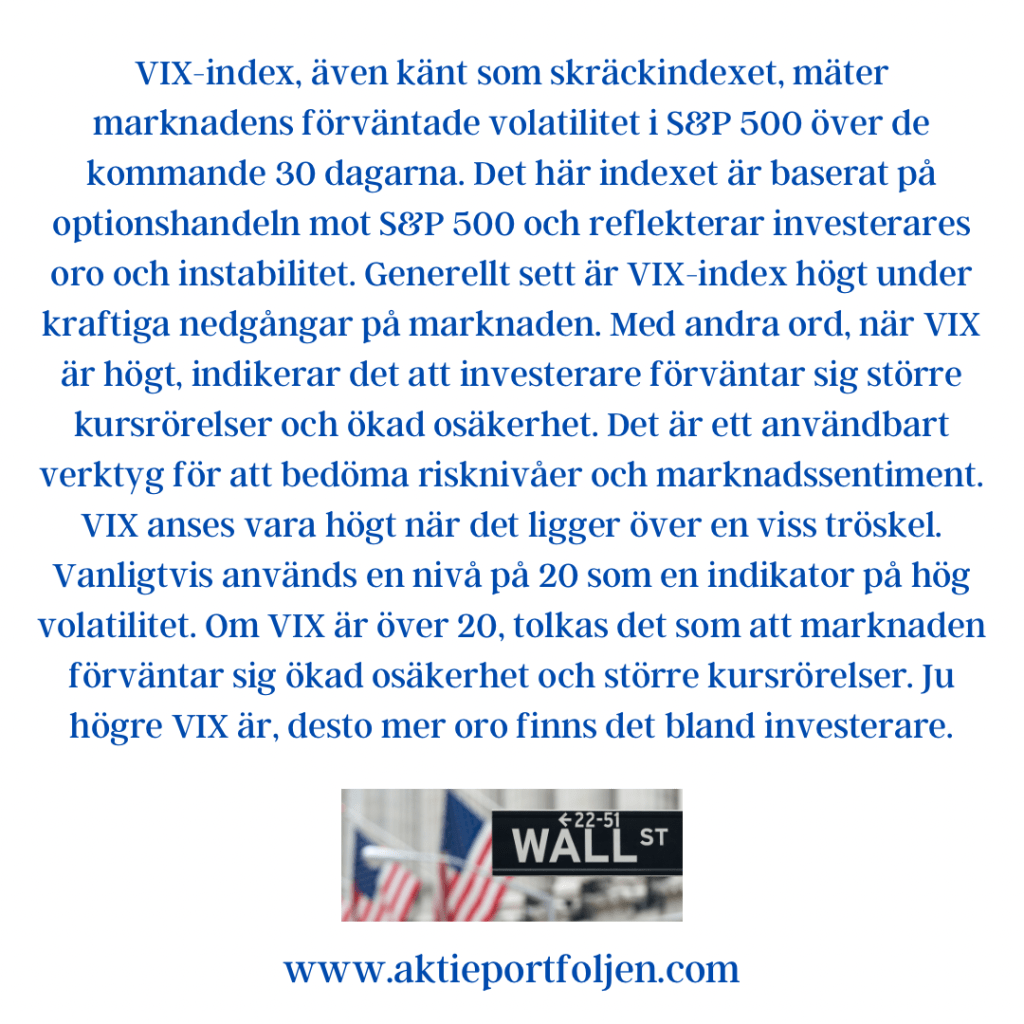 VIX-index, även känt som skräckindexet, mäter marknadens förväntade volatilitet i S&P 500 över de kommande 30 dagarna. Det här indexet är baserat på optionshandeln mot S&P 500 och reflekterar investerares oro och instabilitet. Generellt sett är VIX-index högt under kraftiga nedgångar på marknaden. Med andra ord, när VIX är högt, indikerar det att investerare förväntar sig större kursrörelser och ökad osäkerhet. Det är ett användbart verktyg för att bedöma risknivåer och marknadssentiment. VIX anses vara högt när det ligger över en viss tröskel. Vanligtvis används en nivå på 20 som en indikator på hög volatilitet. Om VIX är över 20, tolkas det som att marknaden förväntar sig ökad osäkerhet och större kursrörelser. Ju högre VIX är, desto mer oro finns det bland investerare.