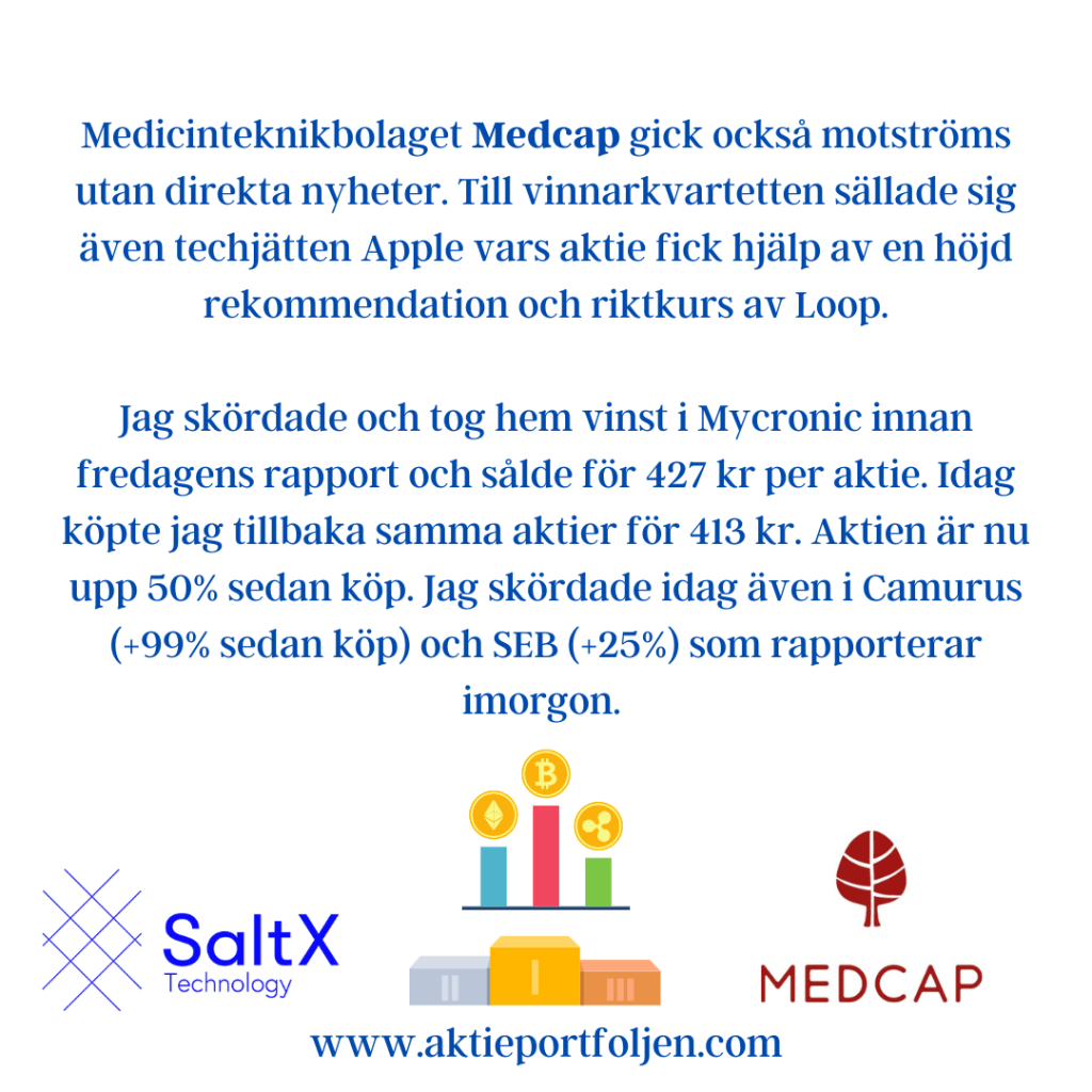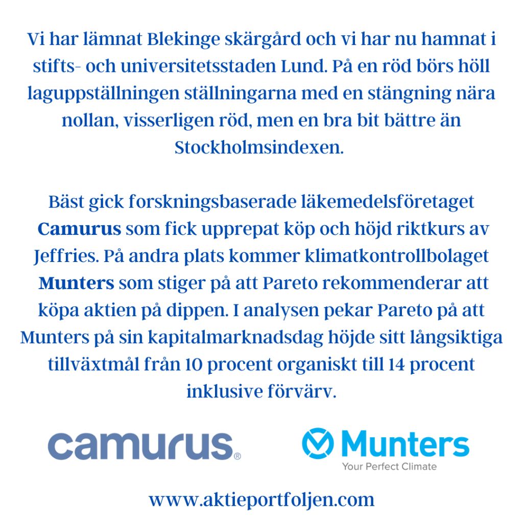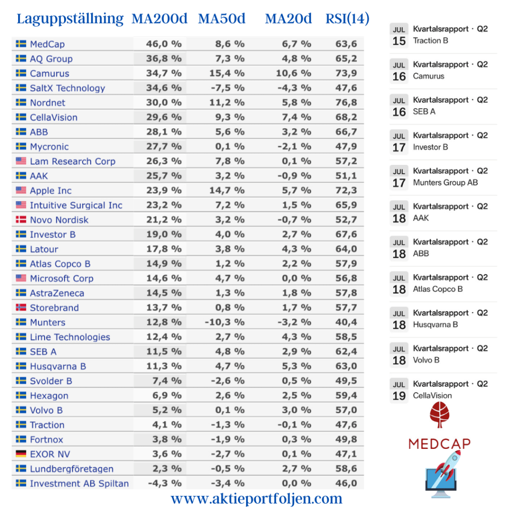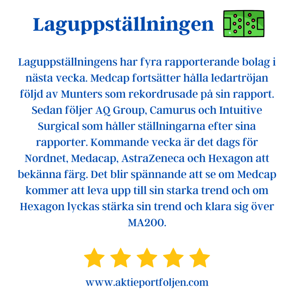 Laguppställningens har fyra rapporterande bolag i nästa vecka. Medcap fortsätter hålla ledartröjan följd av Munters som rekordrusade på sin rapport. Sedan följer AQ Group, Camurus och Intuitive Surgical som håller ställningarna efter sina rapporter. Kommande vecka är det dags för Nordnet, Medacap, AstraZeneca och Hexagon att bekänna färg. Det blir spännande att se om Medcap kommer att leva upp till sin starka trend och om Hexagon lyckas stärka sin trend och klara sig över MA200.