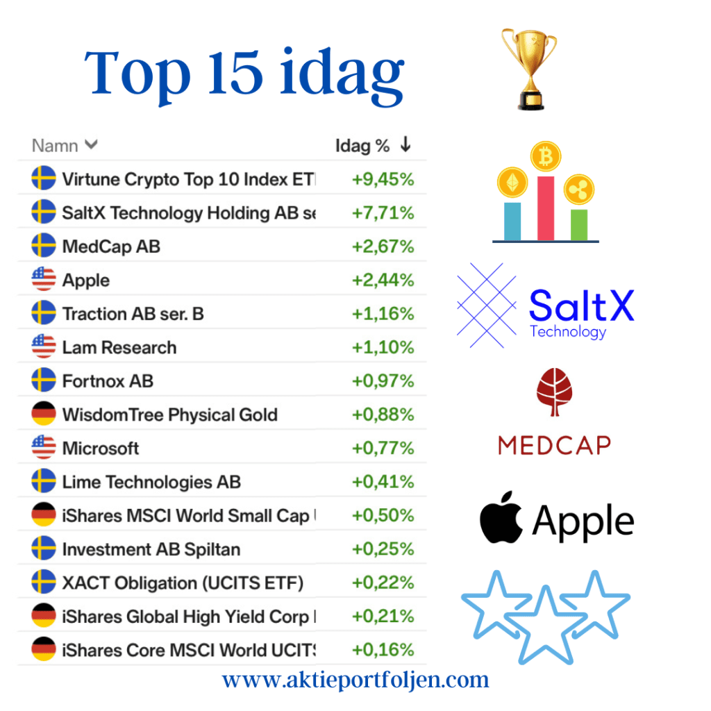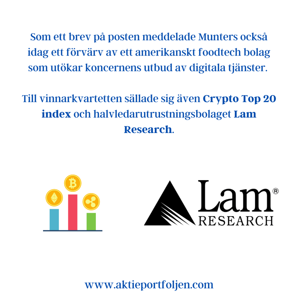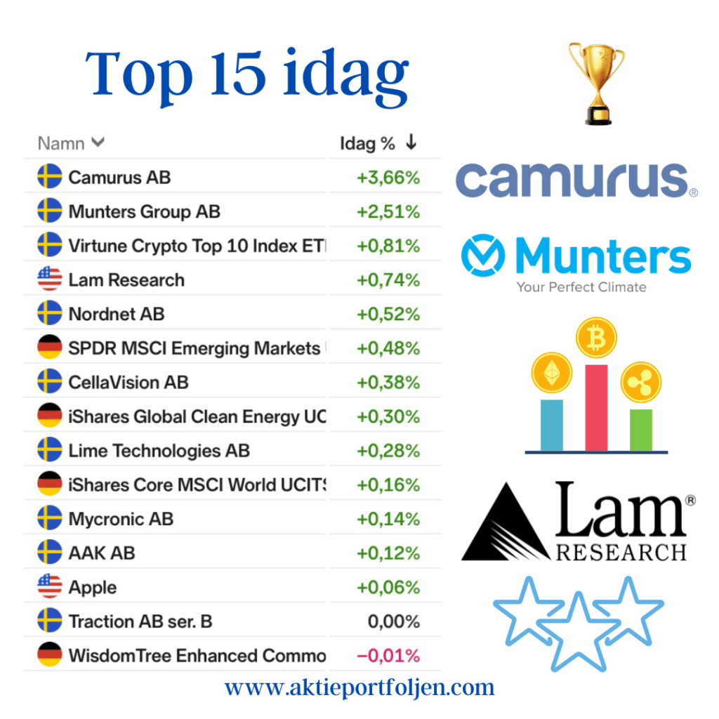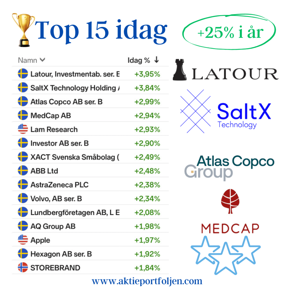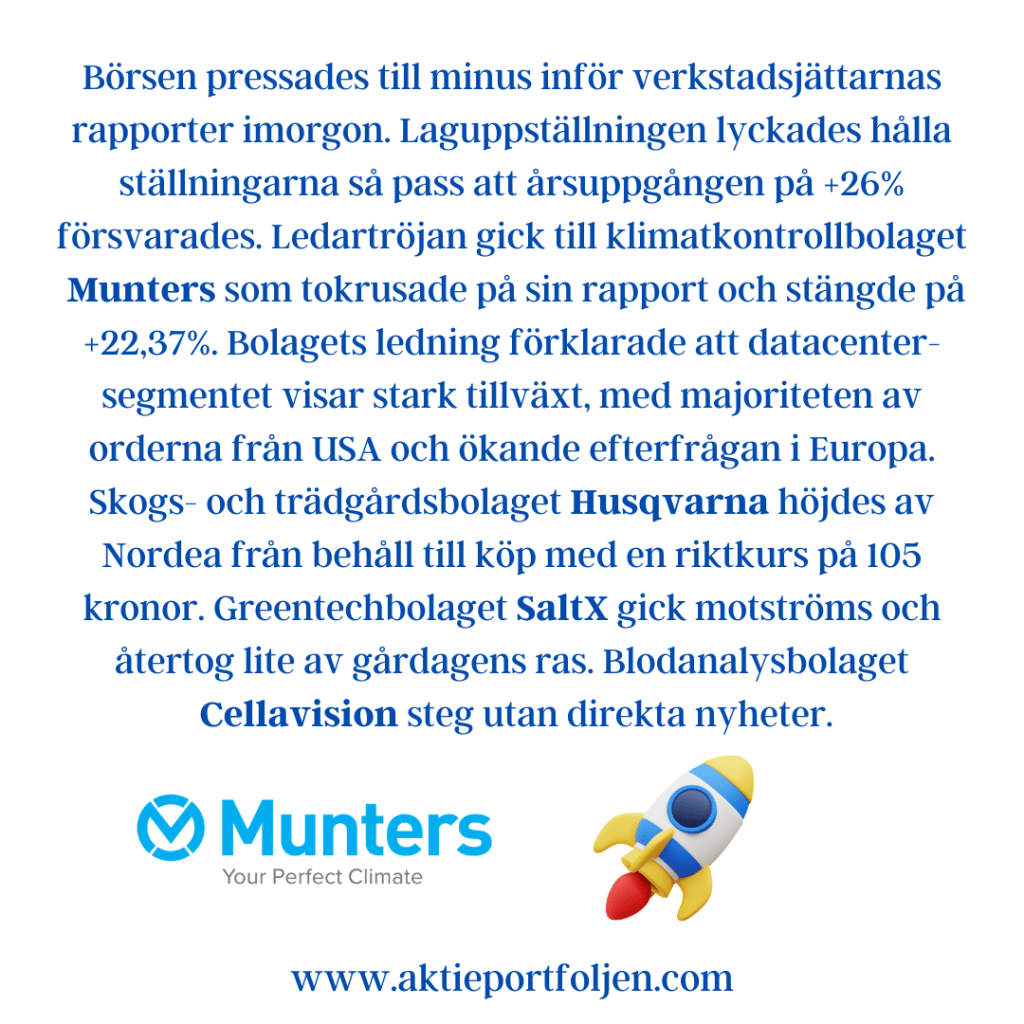 Laguppställningens har fyra rapporterande bolag i nästa vecka. Medcap fortsätter hålla ledartröjan följd av Munters som rekordrusade på sin rapport. Sedan följer AQ Group, Camurus och Intuitive Surgical som håller ställningarna efter sina rapporter. Kommande vecka är det dags för Nordnet, Medacap, AstraZeneca och Hexagon att bekänna färg. Det blir spännande att se om Medcap kommer att leva upp till sin starka trend och om Hexagon lyckas stärka sin trend och klara sig över MA200.
