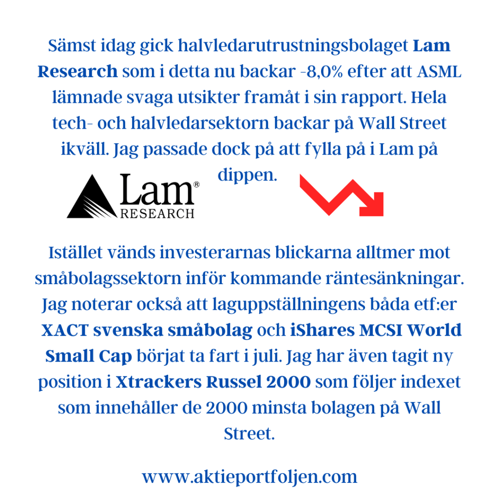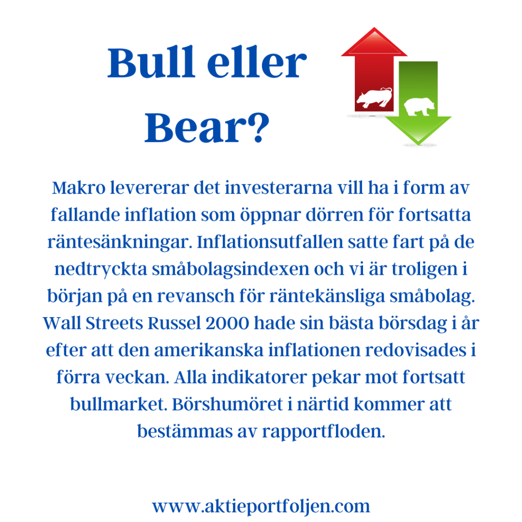 Rapporterna är fortsatt det som sätter börshumöret kommande vecka. Makro levererar det investerarna vill ha i form av fallande inflation som öppnar dörren för fortsatta räntesänkningar. Inflationsutfallen har satt fart på de nedtryckta småbolagsindexen. Sektorsrotationer ökar rädslan hos investerarna vilket också syns i indikatorerna. Hur mycket stryk skall tech- och halvledarsektorna ta i rotationen till småbolag?