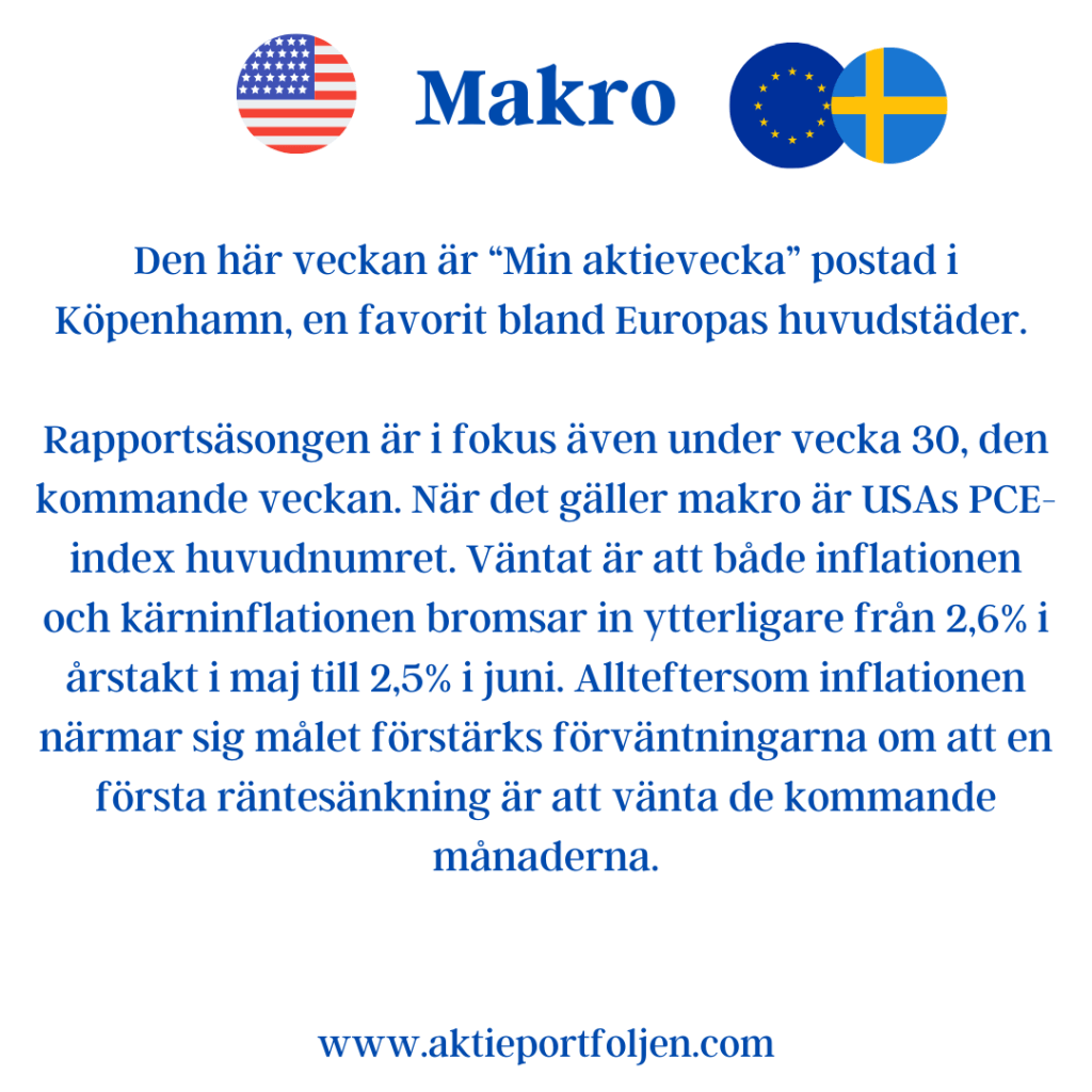 Rapportsäsongen är i fokus även under vecka 30, den kommande veckan. När det gäller makro är USAs PCE-index huvudnumret. Väntat är att både inflationen och kärninflationen bromsar in ytterligare från 2,6% i årstakt i maj till 2,5% i juni. Allteftersom inflationen närmar sig målet förstärks förväntningarna om att en första räntesänkning är att vänta de kommande månaderna.