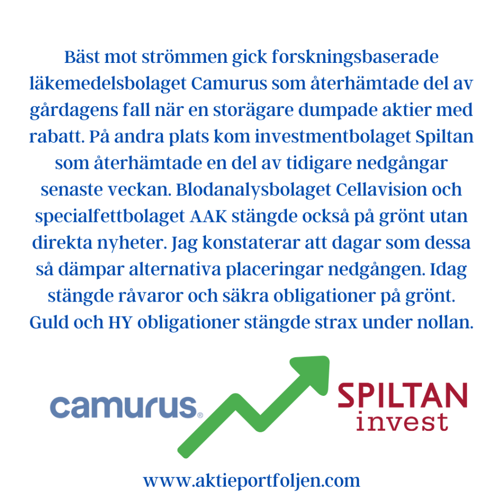 Bäst mot strömmen gick forskningsbaserade läkemedelsbolaget Camurus som återhämtade del av gårdagens fall när en storägare dumpade aktier med rabatt. På andra plats kom investmentbolaget Spiltan som återhämtade en del av tidigare nedgångar senaste veckan. Blodanalysbolaget Cellavision och specialfettbolaget AAK stängde också på grönt utan direkta nyheter. Jag konstaterar att dagar som dessa så dämpar alternativa placeringar nedgången. Idag stängde råvaror och säkra obligationer på grönt. Guld och HY obligationer stängde strax under nollan.