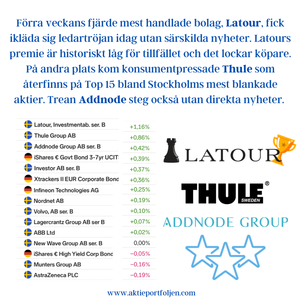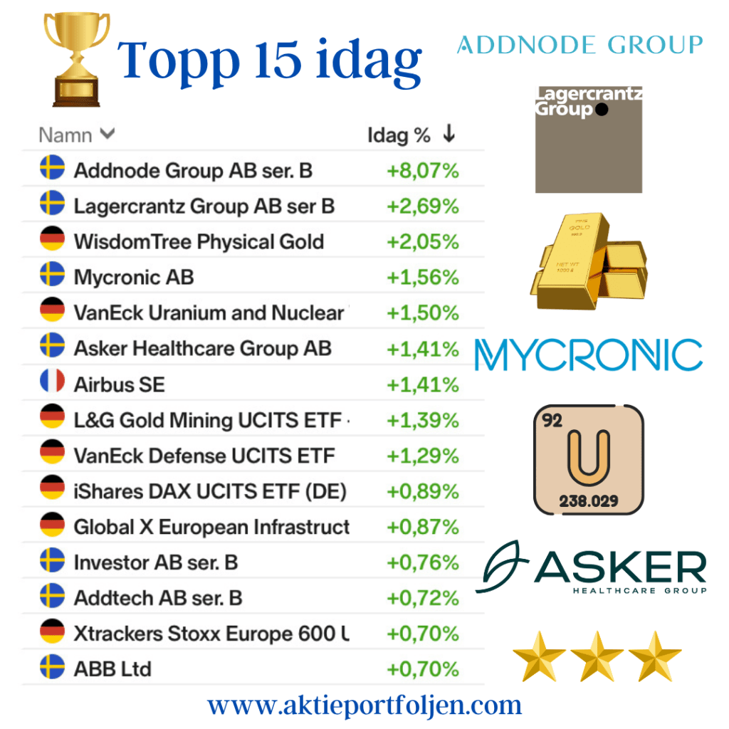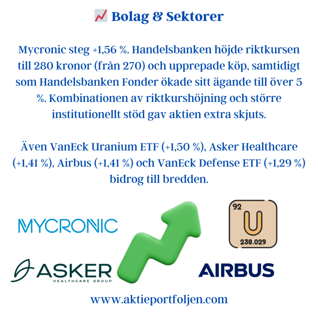Tidigare rapportvinnare Mycronic (+3,68 %) och Addtech (+3,17 %) fortsatte uppåt, vilket bekräftar styrkan i svensk industri.