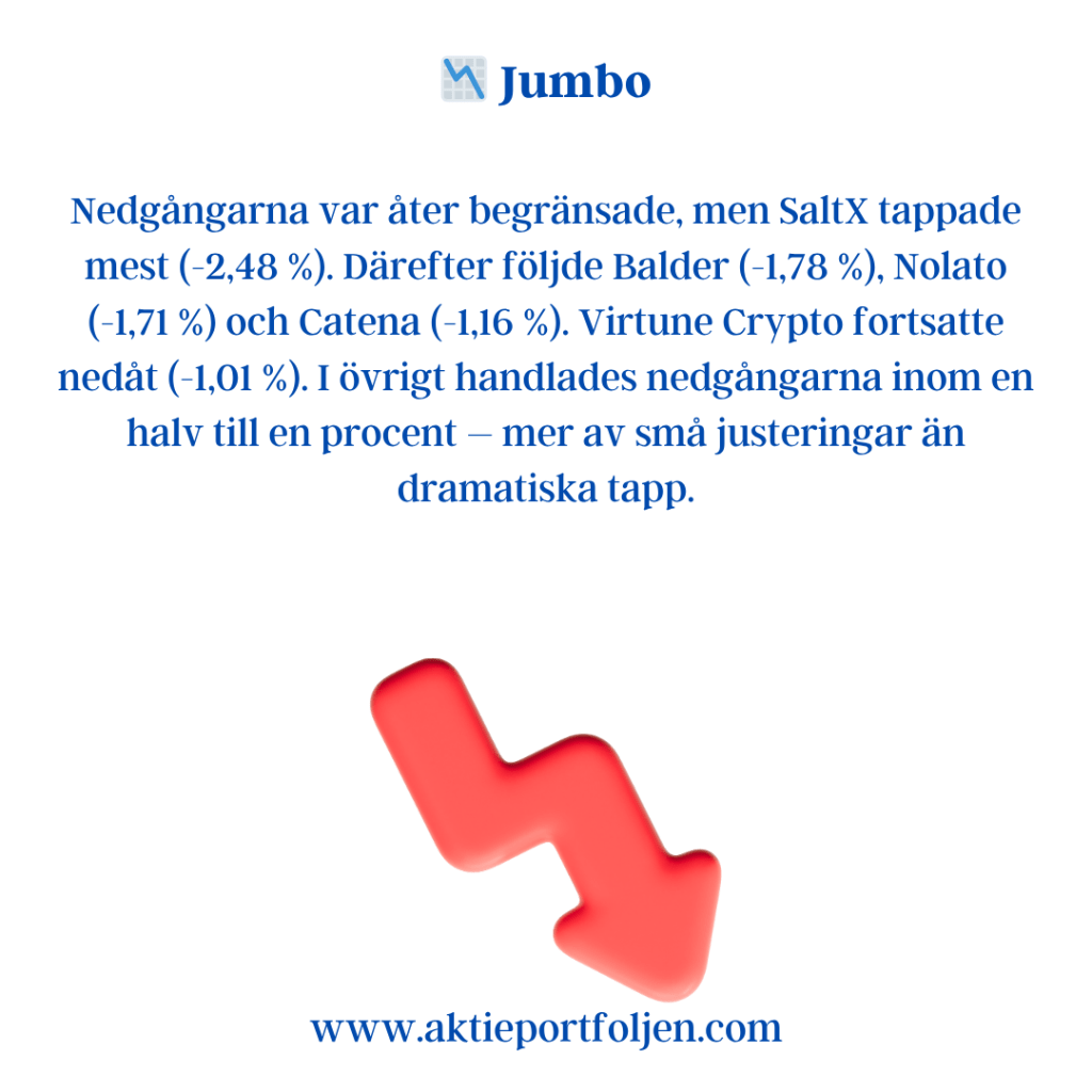 Dagens nedgångar var begränsade, men Storebrand (−2,13 %) tappade mest efter en svagare dag på Oslobörsen. Även New Wave (−1,23 %) backade något efter en period av stark utveckling.