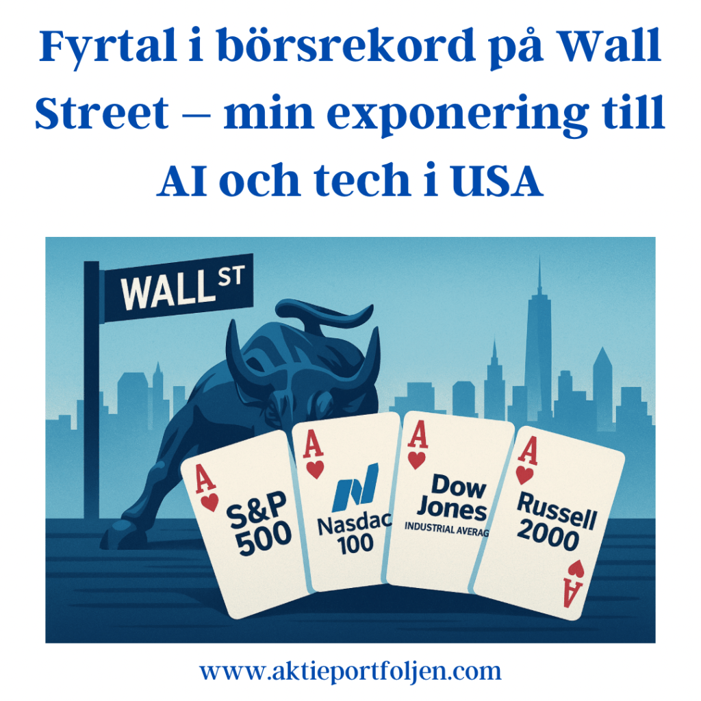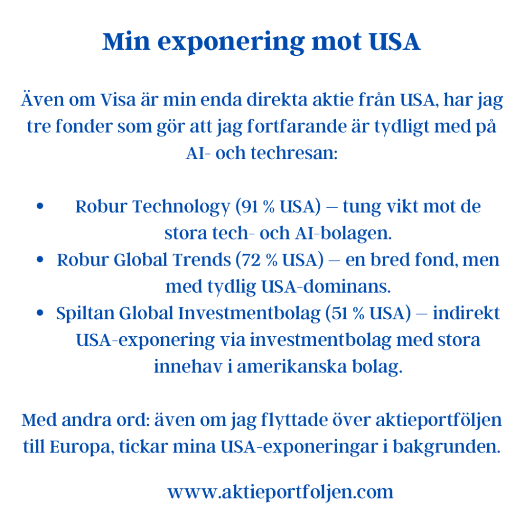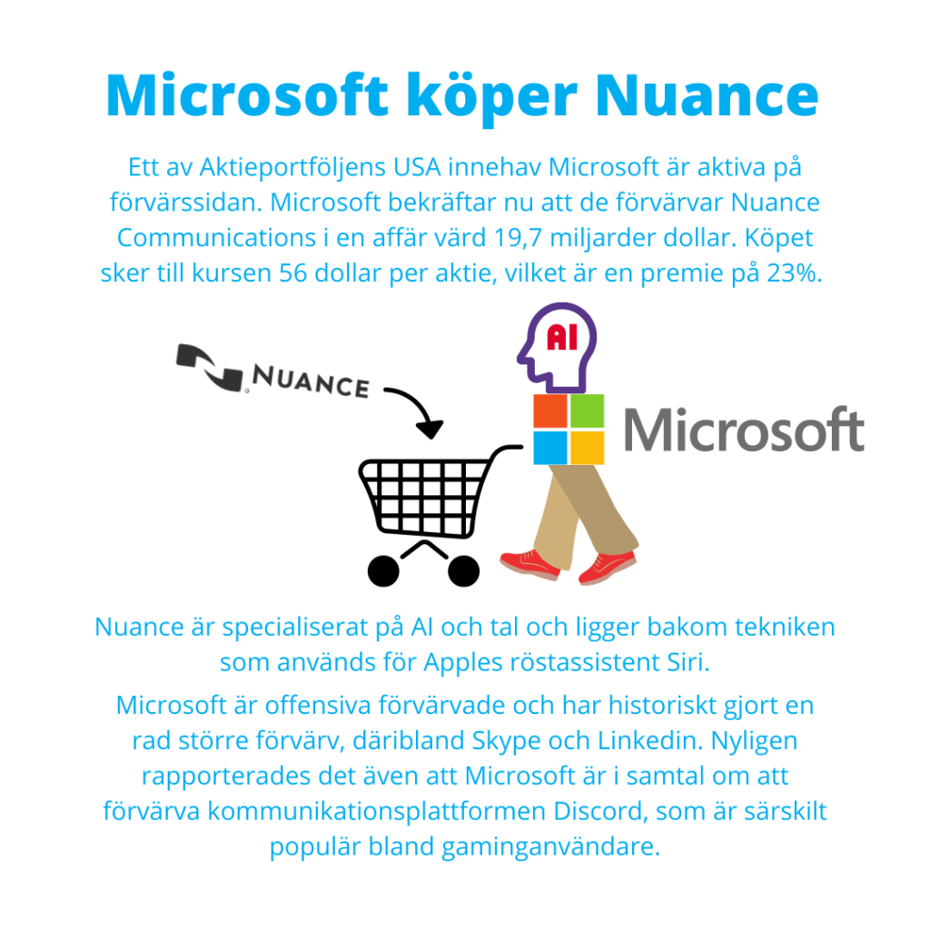 AstraZeneca +3,36% Storebrand +3,22% Clas Ohlson +2,68% Telenor +2,08% L&G Gold Mining UCITS ETF +2,03% Latour +1,49% WisdomTree Physical Gold +1,32% Atlas Copco +1,27% Axfood +1,01% SPDR MSCI Emerging Markets UCITS ETF +0,95% Alfa Laval +0,86% ABB +0,83% Cloetta +0,74% XACT Sverige +0,65% Xtrackers MSCI World ex USA UCITS ETF +0,36%