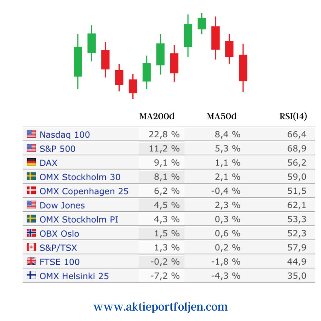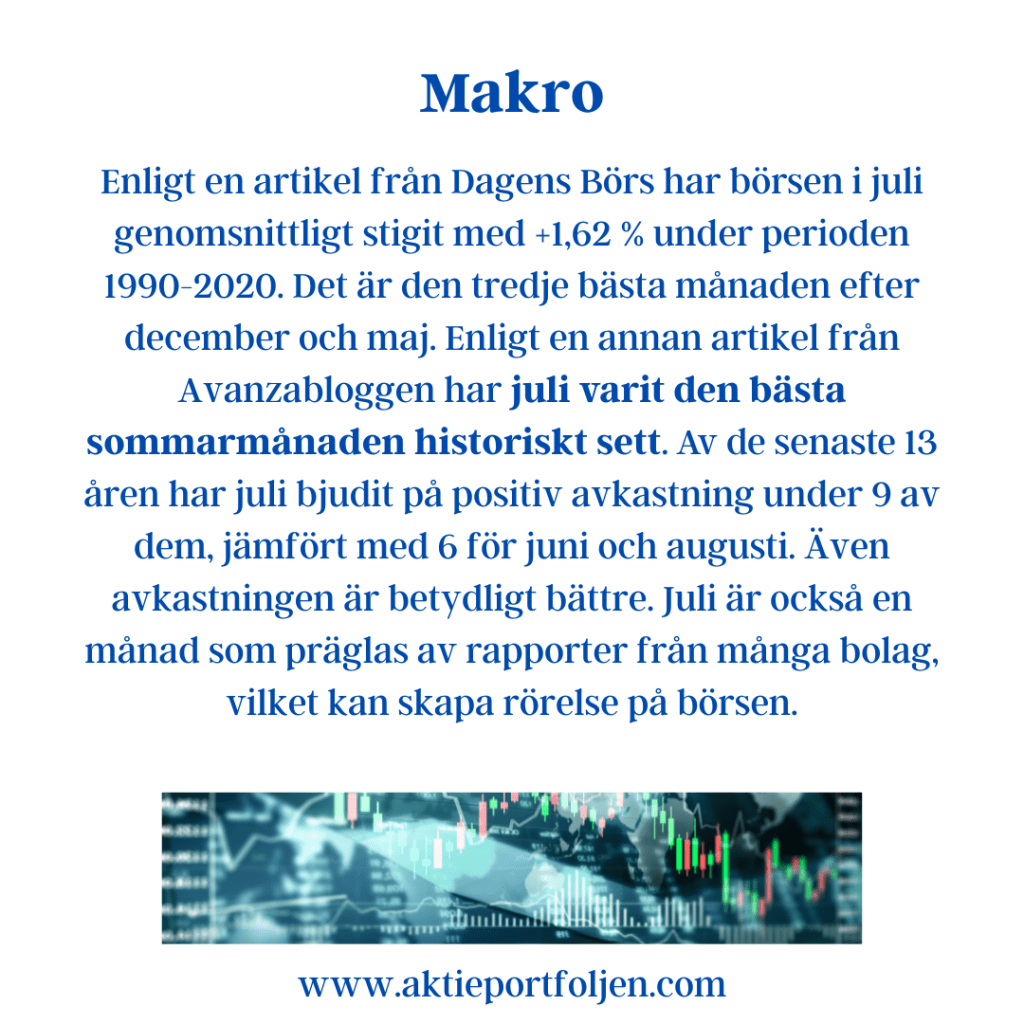 Enligt en artikel från Dagens Börs har börsen i juli genomsnittligt stigit med +1,62 % under perioden 1990-2020. Det är den tredje bästa månaden efter december och maj. Enligt en annan artikel från Avanzabloggen har juli varit den bästa sommarmånaden historiskt sett. Av de senaste 13 åren har juli bjudit på positiv avkastning under 9 av dem, jämfört med 6 för juni och augusti. Även avkastningen är betydligt bättre. Juli är också en månad som präglas av rapporter från många bolag, vilket kan skapa rörelse på börsen. På fredag kommer USA:s jobbrapport och om den försvagats mer än väntat är det tveksamt om FED gör sin förväntade räntehöjning i juli. Wall Street börjar veckan med en klämdag före nationaldagsfirandet den fjärde juli. På onsdag får vi FED:s protokoll från majmötet. I Sverige får vi industri-PMI imorgon och SEB förväntar sig uppgång till 41 från majs treårslägsta på 40,6. låga nivå. Tjänste-PMI som redovisas på onsdag ligger nu stadigt kring 50-nivån de senaste månaderna efter februari månads bottennotering på 46,3. På fredag kommer även BNP-indikatorn och hushållens konsumtion. CNN:s Fear & Greed index för New York börsen pekar på Extreme Greed i marknaden. Av de sju underliggande faktorerna för indexet indikerar fyra på Extreme Greed, två på på Greed och en på Neutral. Swedbanks motsvarande index för svenska börsen pekar på girighet i marknaden.