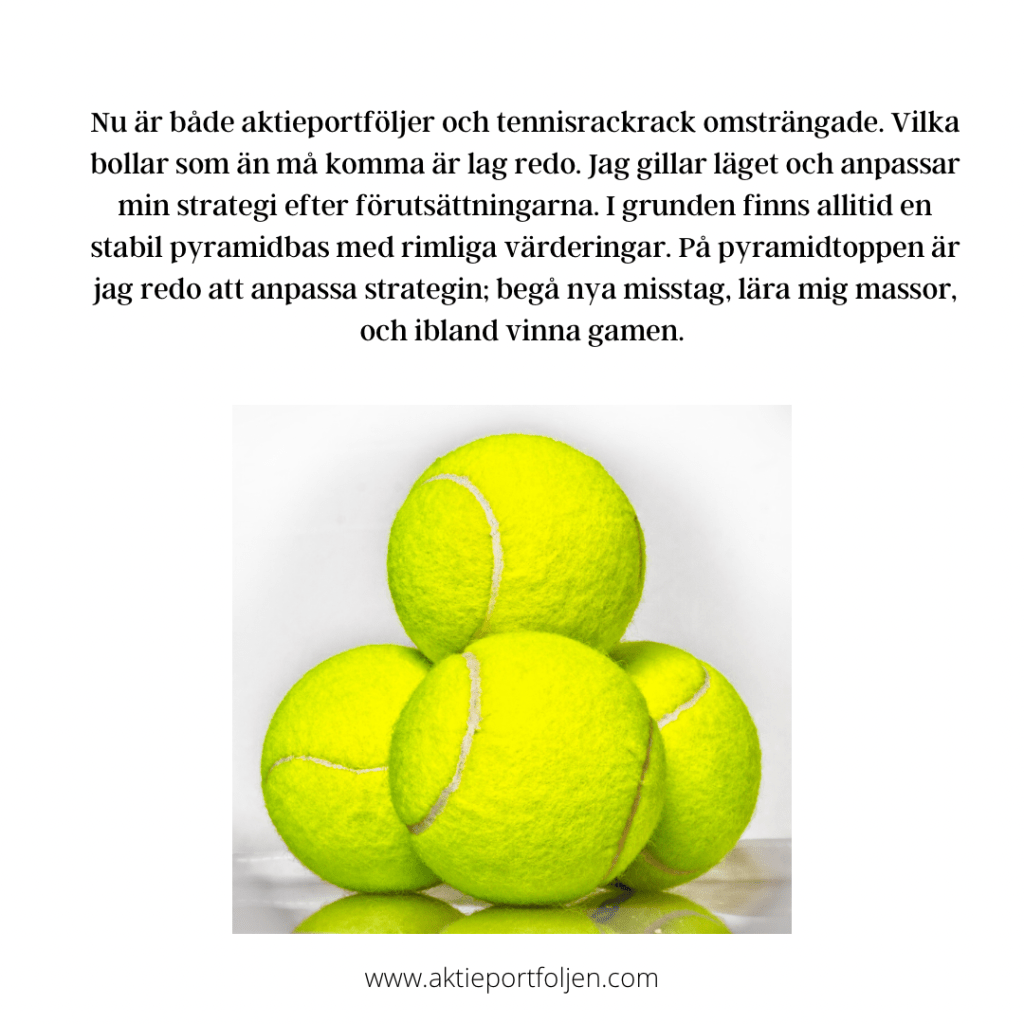 I veckan sa det ”pioooong” och tennisrackets strängar brast i sjätte gamet. På börsen hördes inget ”piooong” men den femte januari blev värderingarna för hårt spända och luften gick börsen. Vi fick skynda oss att ta hem vinsterna i bolag med höga värderingar. De som kör ”buy and hold” eller har en värdestrategi struntar i detta och ser tiden an. Men vi andra fick bråttom, det var ju inga små vinster det handlar om. För min del är omallokeringen någolunda färdig. Jag började faktiskt med omallokeringen redan i höstas. Jag tog då även positioner i ädelmetaller som i nedgången varit en bra hedge på en inflationsorolig börs. Vinsthemtagningarna innebar att jag blev plötsligt likvid inför rapportperioden. Efterhand fyller jag på i värdebolag, industri, råvaror, hälsovård, finans, energi…Är det en hygglig direktavkastning är det också bra. Jag gillar att leta efter rapportvinnare som har ”price powering” och som kan hantera den nya makroekonomiska miljön med räntor och inflation. Innehaven i ädelmetaller/stenar är nu en brahedge. Under januari har det blivit tydligt att utlandsportföljen flera gånger stängt på plus samtidigt som Sverigeportföljen har nedgång. Förra året steg svenska börsen med 34% och t ex den tyska 13%. Med tanke på förra årets hybris i Sverige är det helt logiskt att nedgången blir större här. Jag har varnat för detta innan. Nu är både aktieportföljer och tennisrackrack omsträngade. Vilka bollar som än må komma är lag redo. Jag gillar läget och anpassar min strategi efter förutsättningarna. I grunden finns allitid en stabil pyramidbas med rimliga värderingar. På pyramidtoppen är jag redo att anpassa strategin; begå nya misstag, lära mig massor, och ibland vinna gamen.