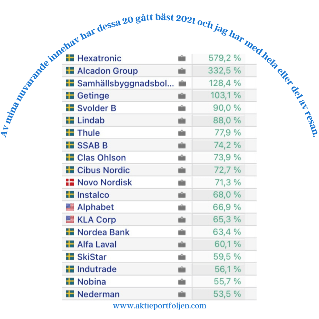 Det är ingen tvekan om att man får vara nöjd med 2021. I början av året var det ESG, förnyelsebar energi och bolag som gynnades av hemmatrenden som gällde, sedan blev det mer fokus på tillväxt/serieförvärvare. Även investmentbolagen gick starkt fram till augusti/september. När ränteoron tog fart blev det trendskifte till bank, värdebolag, industri och bolag med price-powering. Det gällde att hänga med i svängarna. Dessa trendändringar blev utmärkta tillfällen att göra vinsthemtagningar och omallokeringar till vinnande sektorer. Under året gjorde jag 203 köp och 113 sälj av aktier. Grunden i mina investeringar är långsiktighet, men årets macrohändelser och bolagshändelser eller ibland egna strategier har skapat goda möjligheter till swingtrading. Jag föredrar tillväxt och swingtrading, men det skall nämnas att jag även har ett antal högutdelande värdebolag och D-aktier samt preferensaktier som levererat utdelningar likt en bombmatta med 185 utdelningstillfällen under hela 2021. Den dagen jag slutar med heltids aktiehandel kan jag tänka mig att satsa mer på utdelningsaktier. Jag tar ett år i taget och jag har bestämt mig för att köra aktivt hela 2022. Förutom aktiehandel har jag även en hedge i portföljen med ädelmetallerna guld, silver, platinum och palladium. Priset på ädelmetaller har inte varit någon höjdare under året, det är först i slutet av året det tagit fart när den faktiska inflationen tagit fart. Ränteportföljen består av fastighetslån på plattformarna Tessin och Kameo samt personlån på Lendify och Brocc. Här får ränta på ränta effekten göra jobbet och jag återinvesterar ränteintäkter och amorteringar.