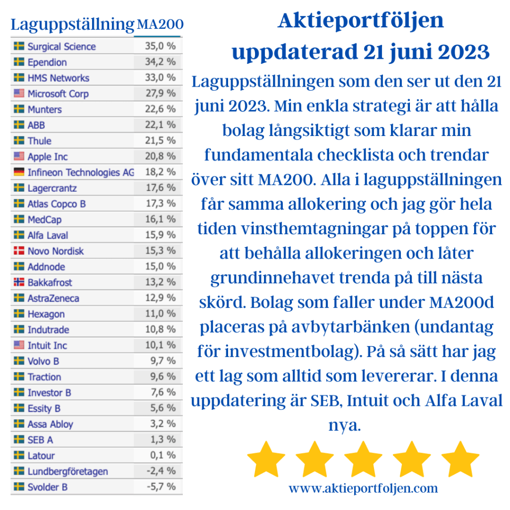 Laguppställningen som den ser ut den 21 juni 2023. Min enkla strategi är att hålla bolag långsiktigt som klarar min fundamentala checklista och trendar över sitt MA200. Alla i laguppställningen får samma allokering och jag gör hela tiden vinsthemtagningar på toppen för att behålla allokeringen och låter grundinnehavet trenda på till nästa skörd. Bolag som faller under MA200d placeras på avbytarbänken (undantag för investmentbolag). På så sätt har jag ett lag som alltid som levererar. I denna uppdatering är SEB, Intuit och Alfa Laval nya.