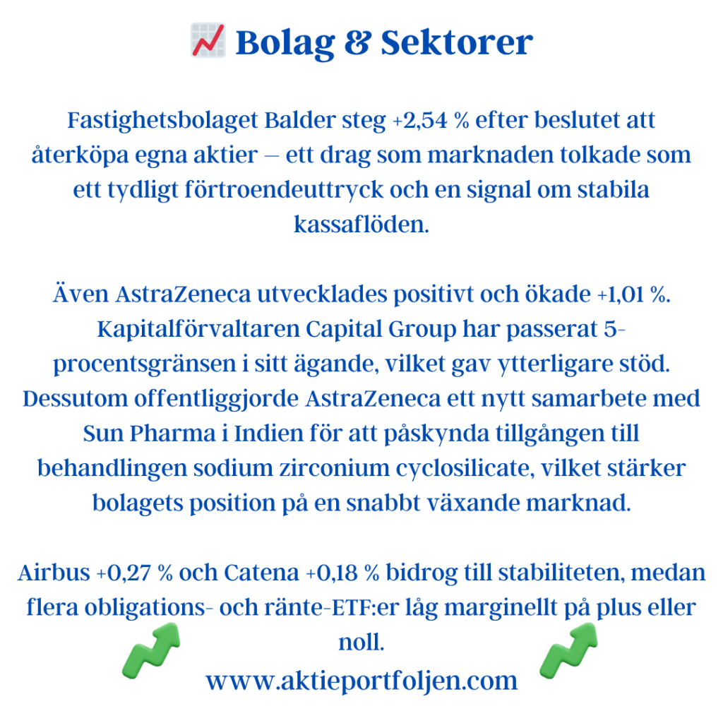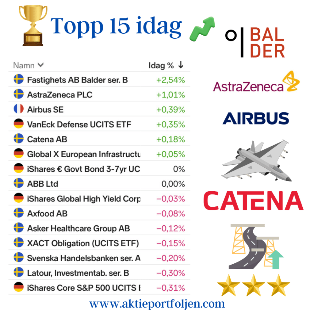 I övrigt präglades Top 15 av en blandning av tematiska ETF:er, defensiva kvalitetsbolag och stabil industri. Försvars- och råvarurelaterade fonder fortsatte att visa styrka, samtidigt som bolag som Handelsbanken, AstraZeneca, Alfa Laval, ABB och Airbus bidrog till en balanserad helhetsbild.