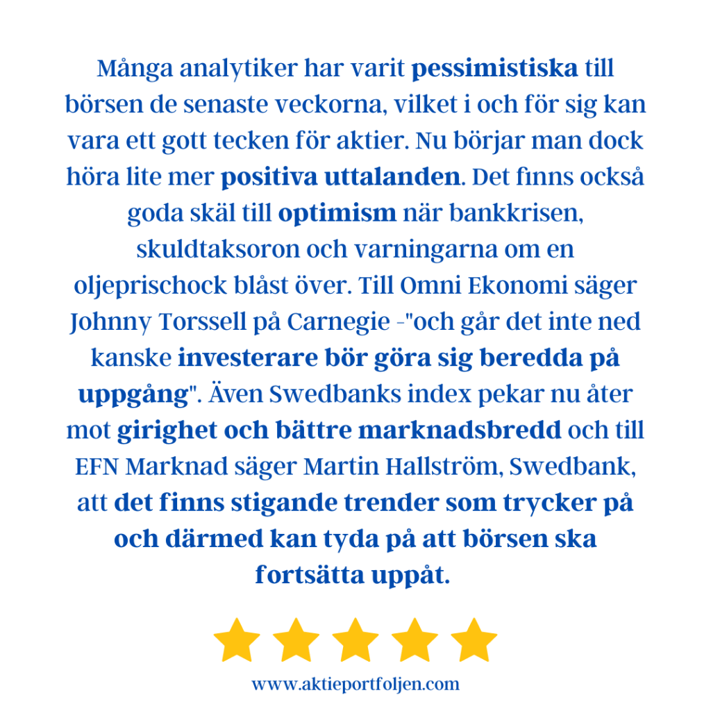 Många analytiker har varit pessimistiska till börsen de senaste veckorna, vilket i och för sig kan vara ett gott tecken för aktier. Nu börjar man dock höra lite mer positiva uttalanden. Det finns också goda skäl till optimism när bankkrisen, skuldtaksoron och varningarna om en oljeprischock blåst över. Till Omni Ekonomi säger Johnny Torssell på Carnegie -”och går det inte ned kanske investerare bör göra sig beredda på uppgång”. Även Swedbanks index pekar nu åter mot girighet och bättre marknadsbredd och till EFN Marknad säger Martin Hallström, Swedbank, att det finns stigande trender som trycker på och därmed kan tyda på att börsen ska fortsätta uppåt.