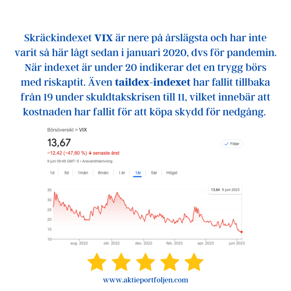 Skräckindexet VIX är nere på årslägsta och har inte varit så här lågt sedan i januari 2020, dvs för pandemin. När indexet är under 20 indikerar det en trygg börs med riskaptit. Även taildex-indexet har fallit tillbaka från 19 under skuldtakskrisen till 11, vilket innebär att kostnaden har fallit för att köpa skydd för nedgång.