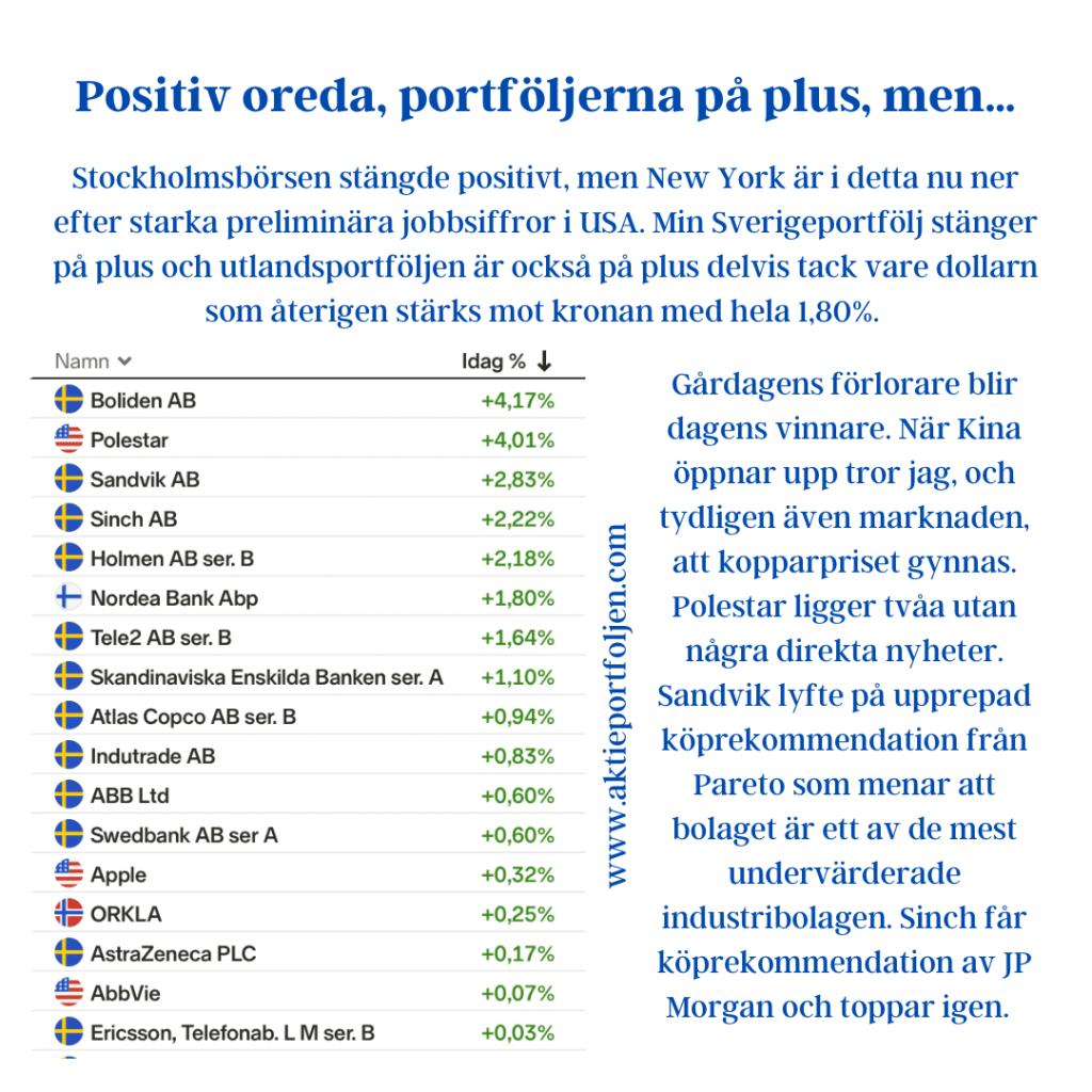 Min laguppställning överträffade Stockholmsindexen och stängde på +1,02%. New York-börsens index stiger tydligt i detta nu efter att producentpriserna minskade kraftigt i mars. Räntorna föll efter siffrorna vilket ger en puff till tekniksektorn inkluderar flera av mina innehav. Bakkafrost toppar med hjälp av en köprekommendation och höjd riktkurs till 1 060 norska kronor (825) från Kepler Cheuvreux. Stigande basmetallpriser lyfte Boliden som stängde på plus 3,4 procent. Danske Bank höjde riktkursen för HMS Networks till 400 kronor (375), upprepar behåll. Samtliga börsindex (de nordiska, London, Frankfurt, Toronto och New York) jag är aktiv på trendar sedan igår över MA200, vilket är ett styrkebesked. VIX, skräckindexet är nere på låga 18,7%. Jag har idag fyllt på i Thule och Indutrade. Samtliga innehav trendar över sitt MA200. Svagast är ASSA ABLOY som balanserar på linjen. Nya spelare hoppar på avbytarbänken och vill in på plan, men jag hoppas ASSAS aktie repar sig, bolaget är det inget fel på.
