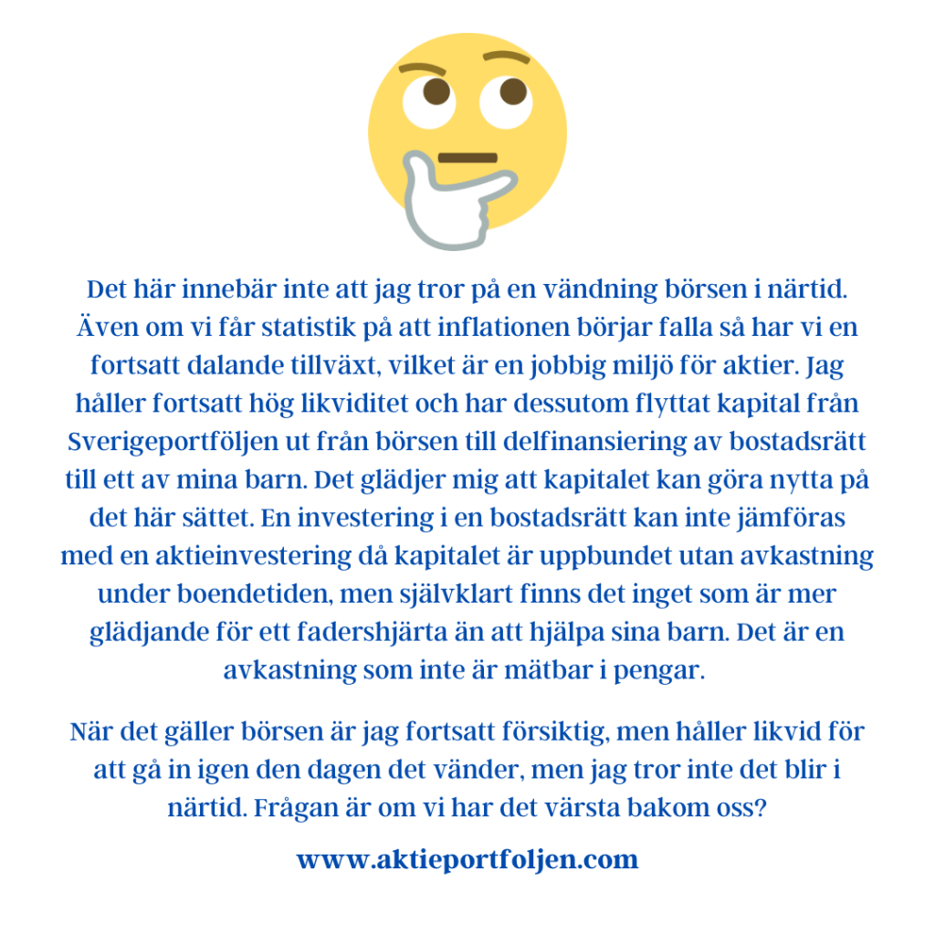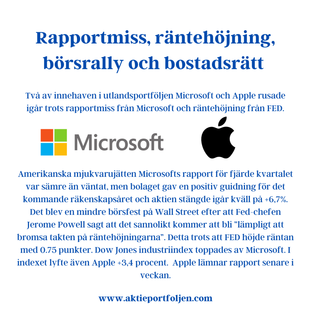 Två av innehaven i utlandsportföljen Microsoft och Apple rusade igår trots rapportmiss från Microsoft och räntehöjning från FED. Amerikanska mjukvarujätten Microsofts rapport för fjärde kvartalet var sämre än väntat, men bolaget gav en positiv guidning för det kommande räkenskapsåret och aktien stängde igår kväll på +6,7%. Det blev en mindre börsfest på Wall Street efter att Fed-chefen Jerome Powell sagt att det sannolikt kommer att bli ”lämpligt att bromsa takten på räntehöjningarna”. Detta trots att FED höjde räntan med 0.75 punkter. Dow Jones industriindex toppades av Microsoft. I indexet lyfte även Apple +3,4 procent. Apple lämnar rapport senare i veckan. Det här innebär inte att jag tror på en vändning börsen i närtid. Även om vi får statistik på att inflationen börjar falla så har vi en fortsatt dalande tillväxt, vilket är en jobbig miljö för aktier. Jag håller fortsatt hög likviditet och har dessutom flyttat kapital från Sverigeportföljen ut från börsen till delfinansiering av bostadsrätt till ett av mina barn. Det glädjer mig att kapitalet kan göra nytta på det här sättet. En investering i en bostadsrätt kan inte jämföras med en aktieinvestering då kapitalet är uppbundet utan avkastning under boendetiden, men självklart finns det inget som är mer glädjande för ett fadershjärta än att hjälpa sina barn. Det är en avkastning som inte är mätbar i pengar. När det gäller börsen är jag fortsatt försiktig, men håller likvid för att gå in igen den dagen det vänder, men jag tror inte det blir i närtid. Frågan är om vi har det värsta bakom oss?