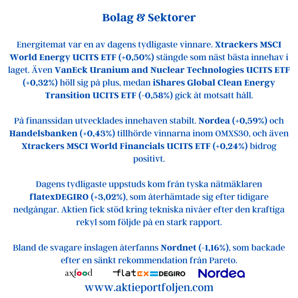 På finanssidan utvecklades innehaven stabilt. Nordea (+0,59%) och Handelsbanken (+0,43%) tillhörde vinnarna inom OMXS30, och även Xtrackers MSCI World Financials UCITS ETF (+0,24%) bidrog positivt.