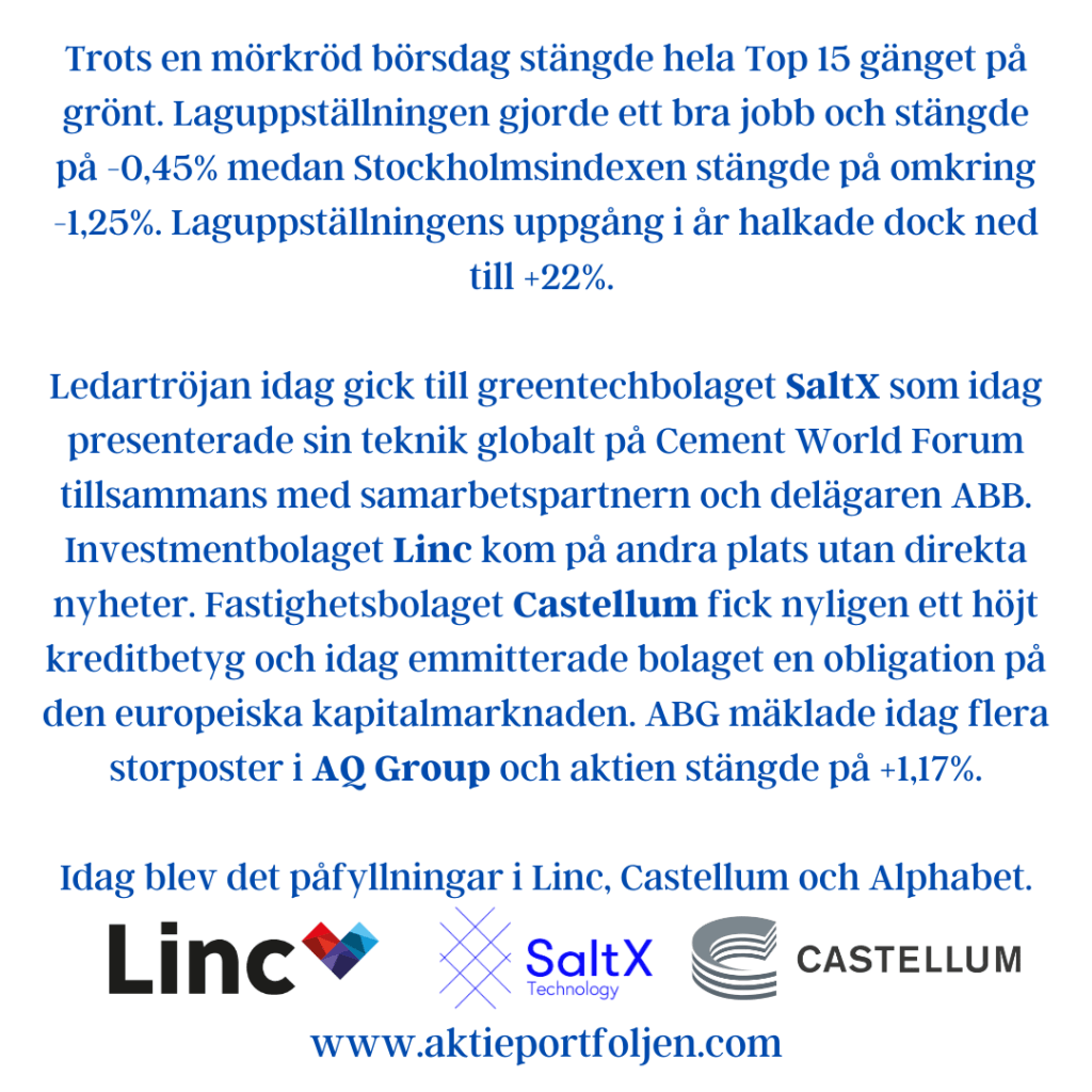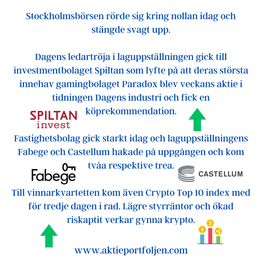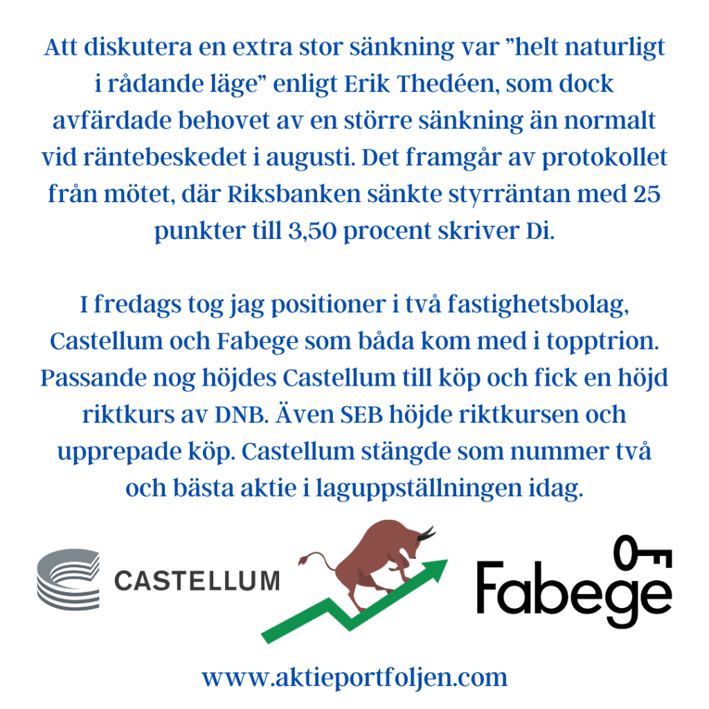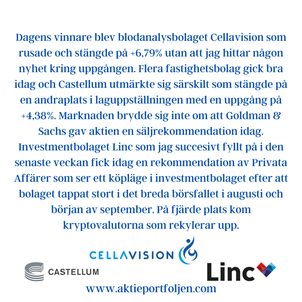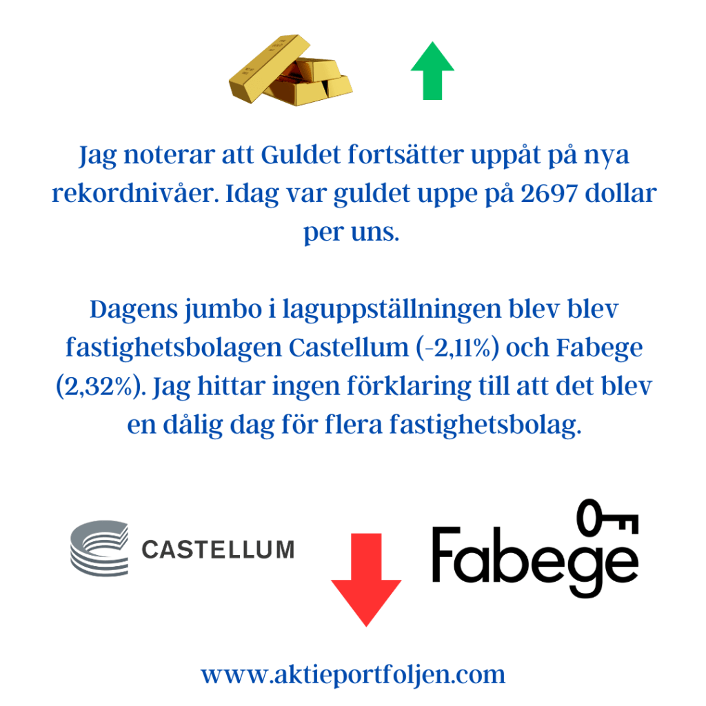 Dagens jumbo i laguppställningen blev blev fastighetsbolagen Castellum (-2,11%) och Fabege (2,32%). Jag hittar ingen förklaring till att det blev en dålig dag för flera fastighetsbolag.