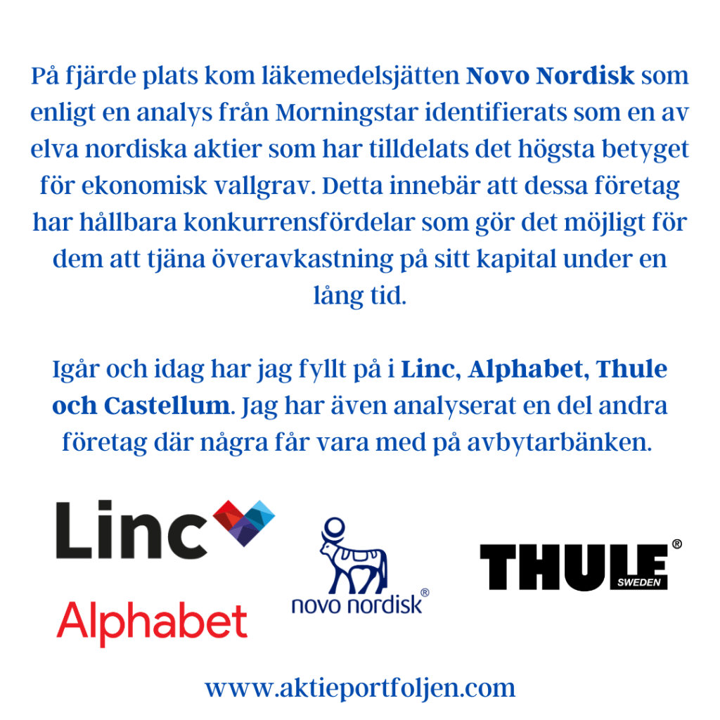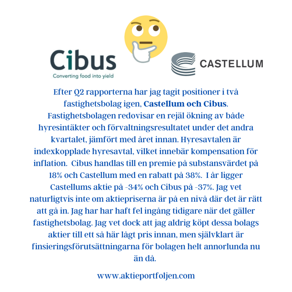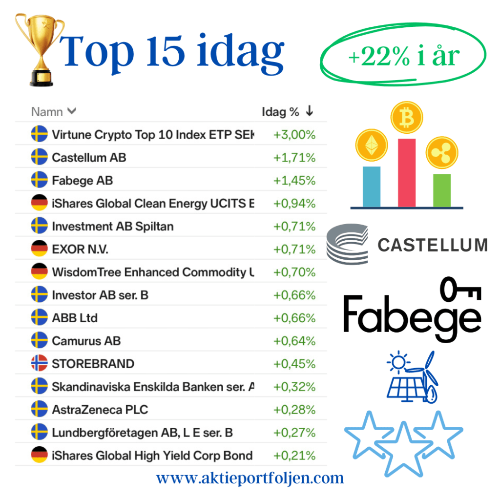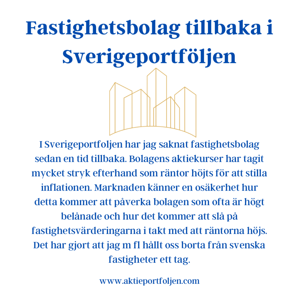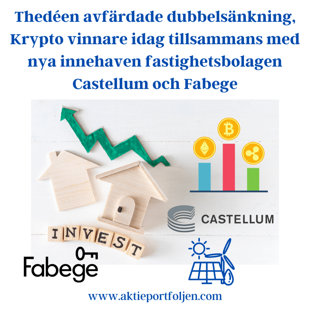 Dagens jumbo i laguppställningen blev blev fastighetsbolagen Castellum (-2,11%) och Fabege (2,32%). Jag hittar ingen förklaring till att det blev en dålig dag för flera fastighetsbolag.