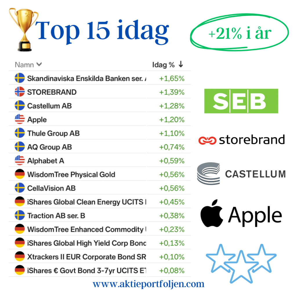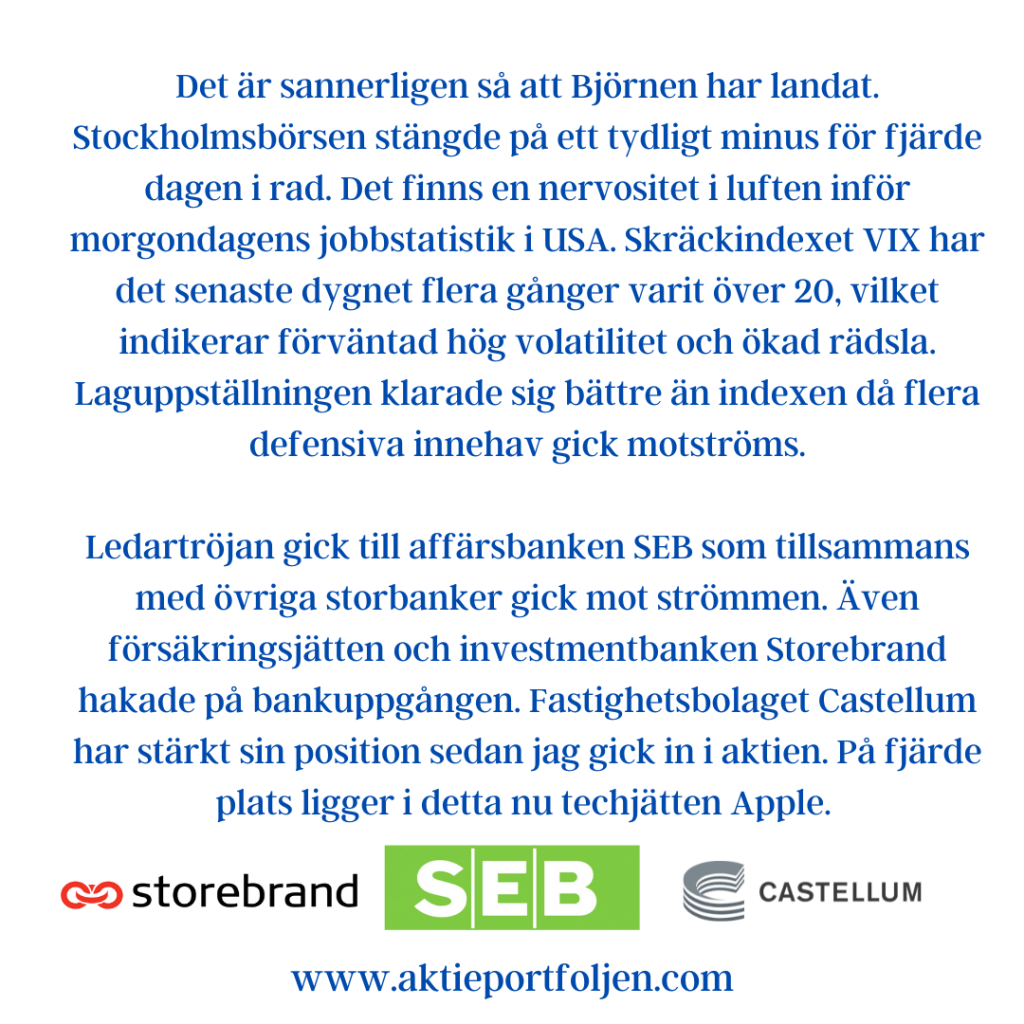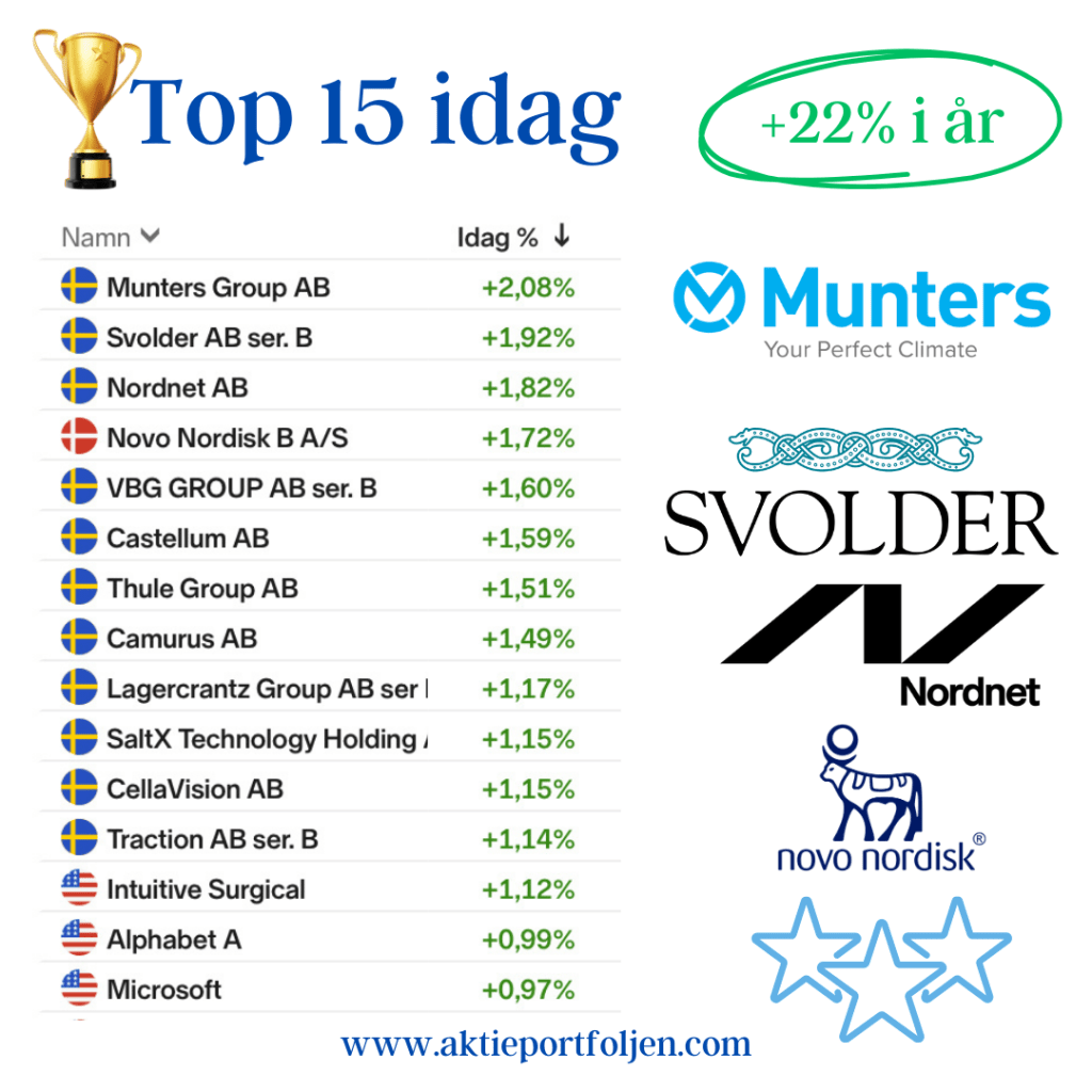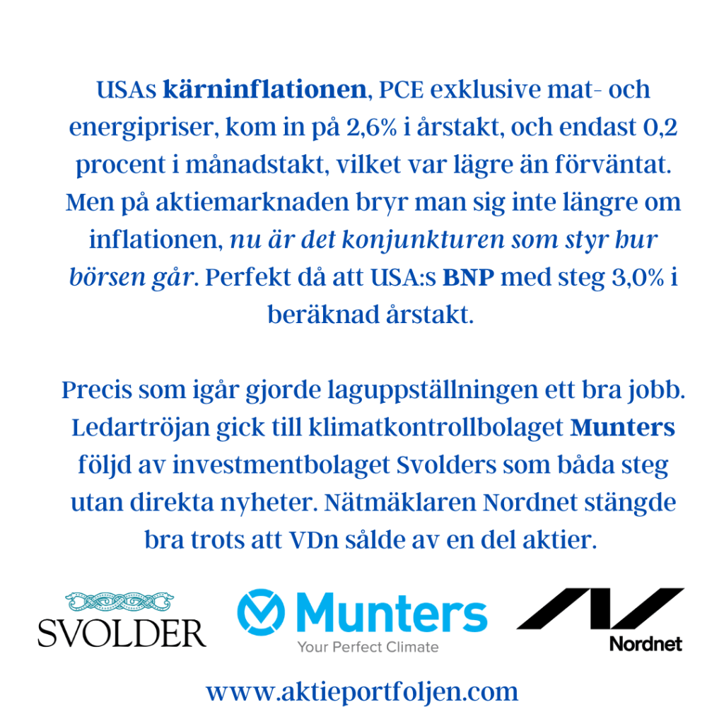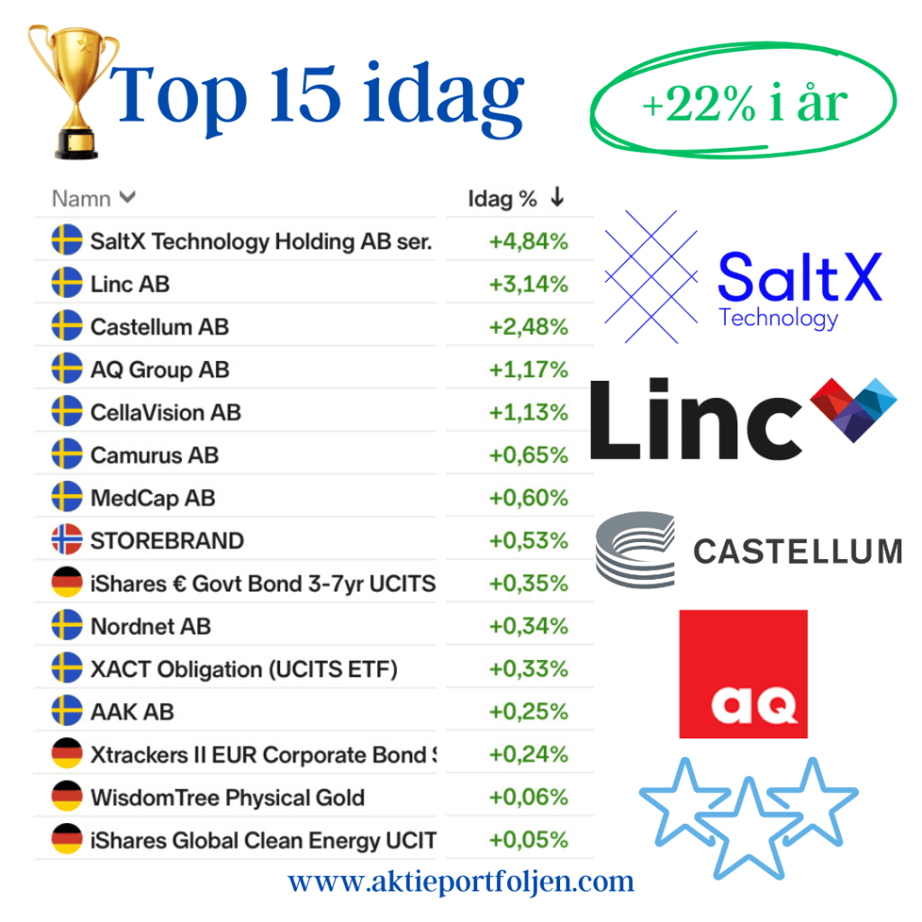 Dagens jumbo i laguppställningen blev blev fastighetsbolagen Castellum (-2,11%) och Fabege (2,32%). Jag hittar ingen förklaring till att det blev en dålig dag för flera fastighetsbolag.