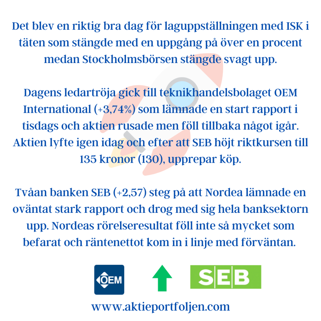 Det blev en riktig bra dag för laguppställningen med ISK i täten som stängde med en uppgång på över en procent medan Stockholmsbörsen stängde svagt upp.