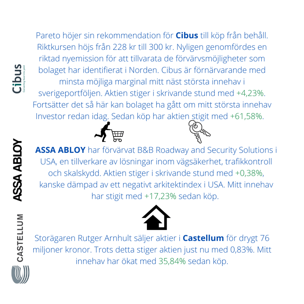 Positiv öppning idag, både OMX30 och OMXSPI stiger med 0,56% just nu. Handeln är avvaktande inför vad de amerikanska terminerna skall visa inför New York börsens öppning i eftermiddag. Senare ikväll får vi dessutom räntebesked från amerikanska FED. Presskonferens med Powell hålls kl 20:30 och direktsänds via Di tv. Just nu är mina europeiska portföljer upp +30 tkr, men det är omöjligt att veta om portföljerna stänger på plus eller minus ikväll med tanke på marknadens nervositet inför de besked vi väntar på. Dagen börjar med att jag följer Nordnets event ”Börsåret 2020 – Detta är sakerna att hålla koll på!”. Intressant att höra Swedbanks aktiechef Fredrik Warg och Nordnets Alexander spåna om kommande år utifrån inflation, räntor m m. De tips och råd som ges följer i stort sett de strategier jag själv anammat och som jag skrivit om i tidigare inlägg. Pareto höjer sin rekommendation för Cibus till köp från behåll. Riktkursen höjs från 228 kr till 300 kr. Nyligen genomfördes en riktad nyemission för att tillvarata de förvärvsmöjligheter som bolaget har identifierat i Norden. Cibus är förnärvarande med minsta möjliga marginal mitt näst största innehav i sverigeportföljen. Aktien stiger i skrivande stund med +4,23%. Fortsätter det så här kan bolaget ha gått om mitt största innehav Investor redan idag. Sedan köp har aktien stigit med +61,58%. ASSA ABLOY har förvärvat B&B Roadway and Security Solutions i USA, en tillverkare av lösningar inom vägsäkerhet, trafikkontroll och skalskydd. Aktien stiger i skrivande stund med +0,38%, kanske dämpad av ett negativt arkitektindex i USA. Mitt innehav har stigit med +17,23% sedan köp. Storägaren Rutger Arnhult säljer aktier i Castellum för drygt 76 miljoner kronor. Trots detta stiger aktien just nu med 0,83%. Mitt innehav har ökat med 35,84% sedan köp.