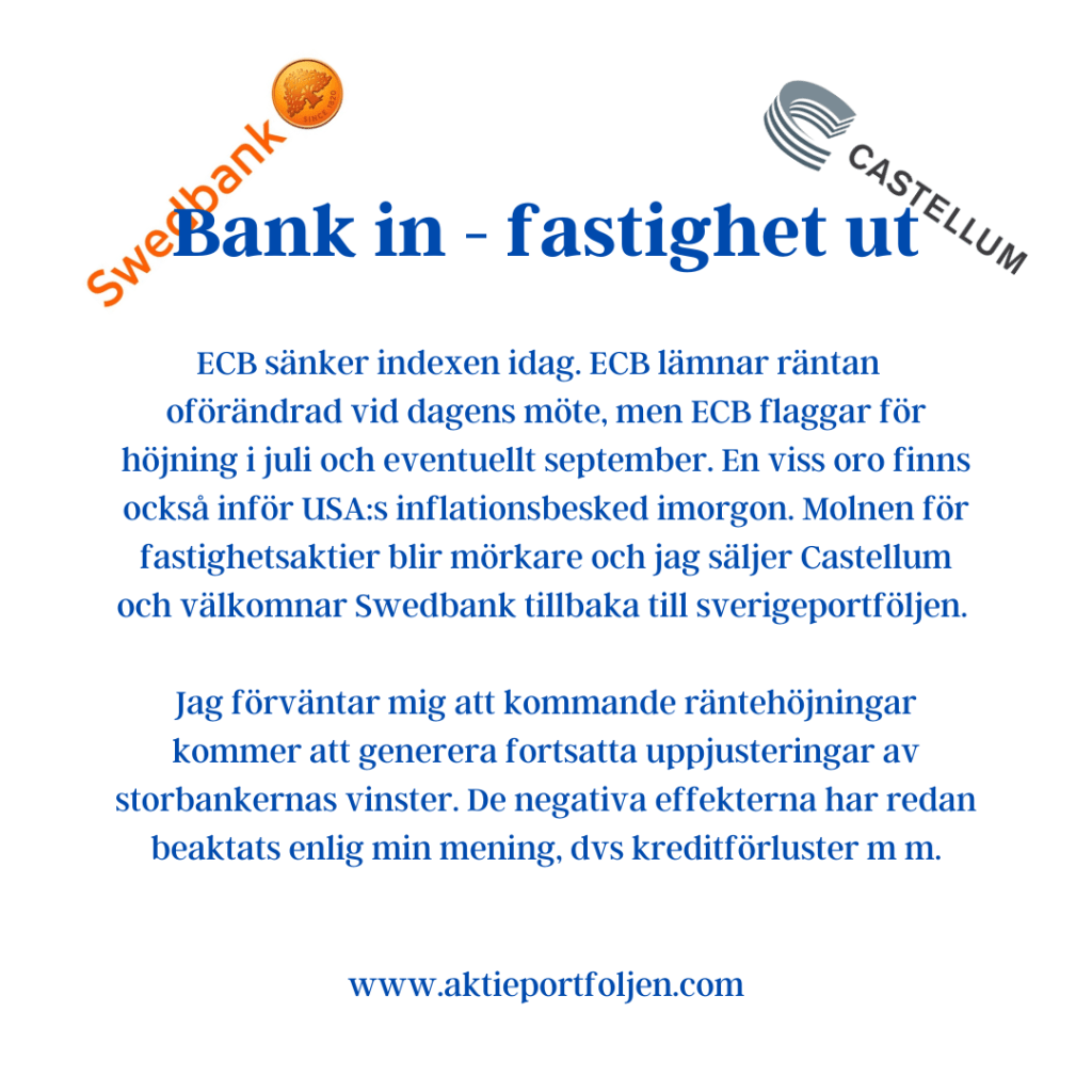 ECB sänker indexen idag. ECB lämnar räntan oförändrad vid dagens möte, men ECB flaggar för höjning i juli och eventuellt september. En viss oro finns också inför USA:s inflationsbesked imorgon. Molnen för fastighetsaktier blir mörkare och jag säljer Castellum och välkomnar Swedbank tillbaka till sverigeportföljen. Jag förväntar mig att kommande räntehöjningar kommer att generera fortsatta uppjusteringar av storbankernas vinster. De negativa effekterna har redan beaktats enlig min mening, dvs kreditförluster m m. Förutom Swedbank finns redan SEB i sverigeportföljen och Nordea och Lazard i utlandsportföljen. Jag släpper inte fastigheter helt ännu då jag har kvar Cibus och Lundbergföretagen. Den sistnämnda är inte bara fastigheter utan ett investmentbolag andra innehav också. I utlandsportföljen har fastighetsaktierna klarat sig riktigt bra i år. Där återfinns amerikanska W.P Carey, kanadensiska Northwest healthcare och Riocan.