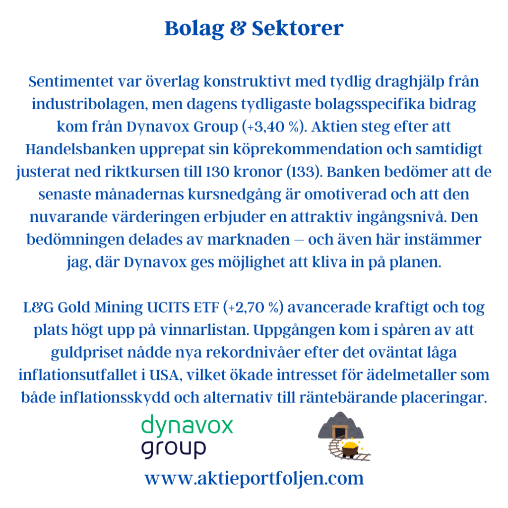 Sentimentet var överlag konstruktivt med tydlig draghjälp från industribolagen, men dagens tydligaste bolagsspecifika bidrag kom från Dynavox Group (+3,40 %). Aktien steg efter att Handelsbanken upprepat sin köprekommendation och samtidigt justerat ned riktkursen till 130 kronor (133). Banken bedömer att de senaste månadernas kursnedgång är omotiverad och att den nuvarande värderingen erbjuder en attraktiv ingångsnivå. Den bedömningen delades av marknaden – och även här instämmer jag, där Dynavox ges möjlighet att kliva in på planen.