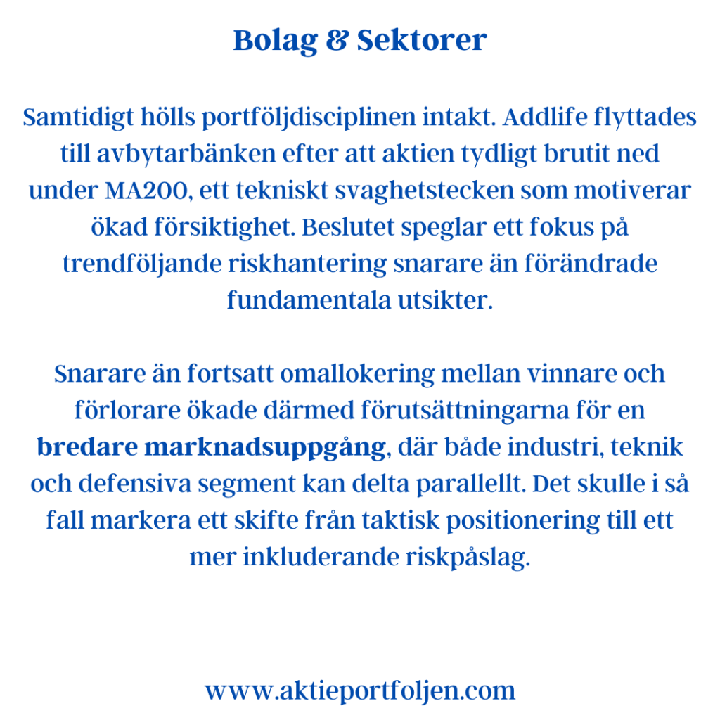 Samtidigt hölls portföljdisciplinen intakt. Addlife flyttades till avbytarbänken efter att aktien tydligt brutit ned under MA200, ett tekniskt svaghetstecken som motiverar ökad försiktighet. Beslutet speglar ett fokus på trendföljande riskhantering snarare än förändrade fundamentala utsikter.