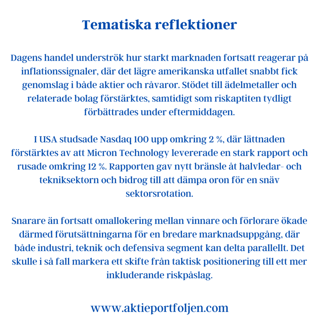 Dagens handel underströk hur starkt marknaden fortsatt reagerar på inflationssignaler, där det lägre amerikanska utfallet snabbt fick genomslag i både aktier och råvaror. Stödet till ädelmetaller och relaterade bolag förstärktes, samtidigt som riskaptiten tydligt förbättrades under eftermiddagen.
