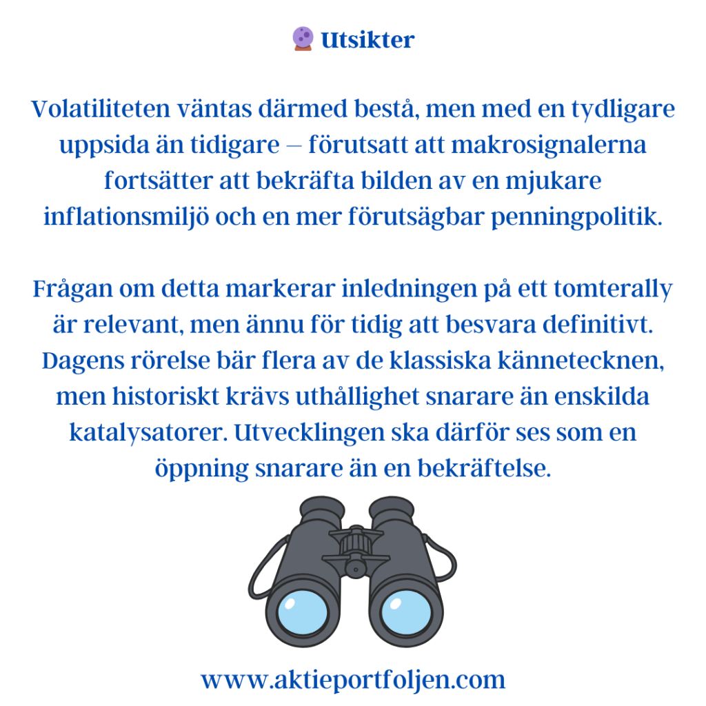 Volatiliteten väntas därmed bestå, men med en tydligare uppsida än tidigare – förutsatt att makrosignalerna fortsätter att bekräfta bilden av en mjukare inflationsmiljö och en mer förutsägbar penningpolitik.