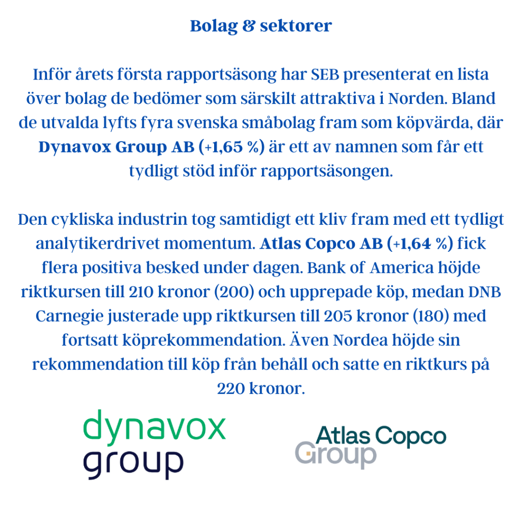 Den cykliska industrin tog samtidigt ett kliv fram med ett tydligt analytikerdrivet momentum. Atlas Copco AB (+1,64 %) fick flera positiva besked under dagen. Bank of America höjde riktkursen till 210 kronor (200) och upprepade köp, medan DNB Carnegie justerade upp riktkursen till 205 kronor (180) med fortsatt köprekommendation. Även Nordea höjde sin rekommendation till köp från behåll och satte en riktkurs på 220 kronor.