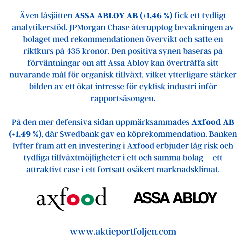 På den mer defensiva sidan uppmärksammades Axfood AB (+1,49 %), där Swedbank gav en köprekommendation. Banken lyfter fram att en investering i Axfood erbjuder låg risk och tydliga tillväxtmöjligheter i ett och samma bolag – ett attraktivt case i ett fortsatt osäkert marknadsklimat.