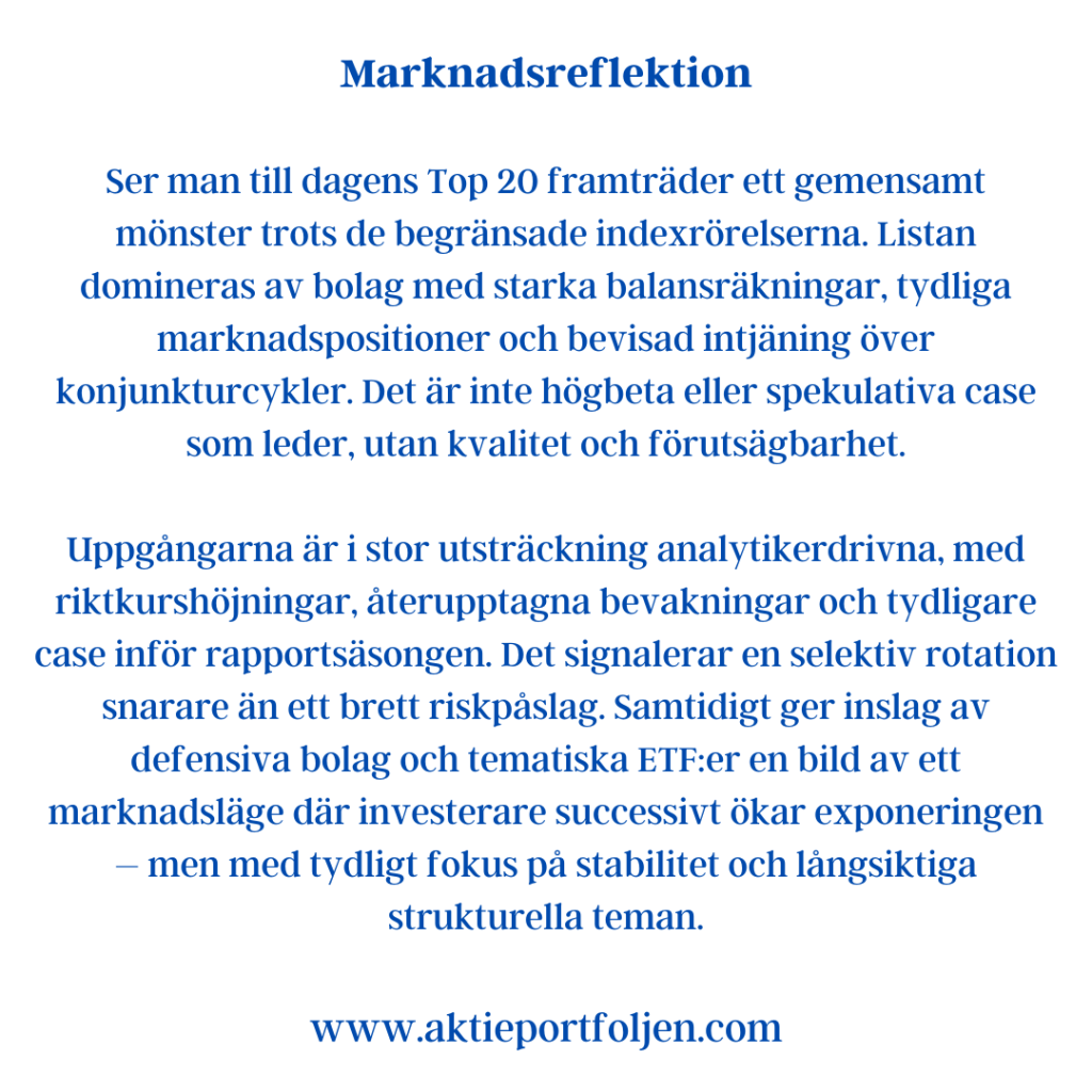 Ser man till dagens Top 20 framträder ett gemensamt mönster trots de begränsade indexrörelserna. Listan domineras av bolag med starka balansräkningar, tydliga marknadspositioner och bevisad intjäning över konjunkturcykler. Det är inte högbeta eller spekulativa case som leder, utan kvalitet och förutsägbarhet.