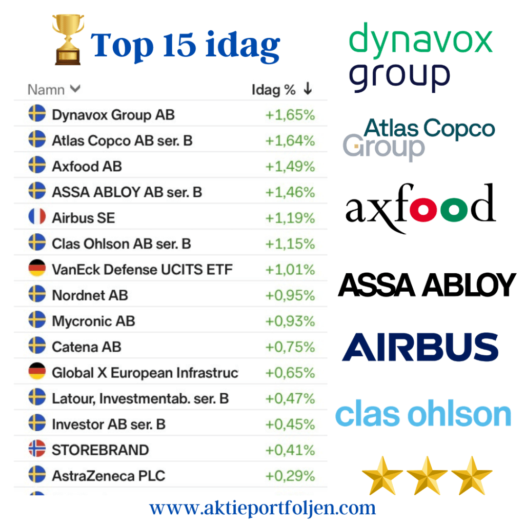 Dynavox Group AB (+1,65 %) Atlas Copco AB ser. B (+1,64 %) Axfood AB (+1,49 %) ASSA ABLOY AB ser. B (+1,46 %) Airbus SE (+1,19 %) Clas Ohlson AB ser. B (+1,15 %) VanEck Defense UCITS ETF (+1,01 %) Nordnet AB (+0,95 %) Mycronic AB (+0,93 %) Catena AB (+0,75 %) Global X European Infrastructure Development UCITS ETF (+0,65 %) Latour Investment AB ser. B (+0,47 %) Investor AB ser. B (+0,45 %) Storebrand ASA (+0,41 %) AstraZeneca PLC (+0,29 %)