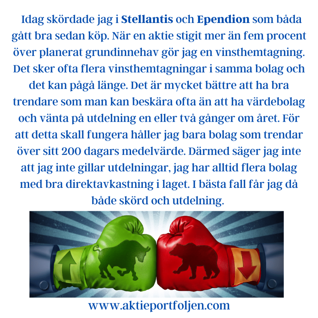 Citi har för första gången på tio år slopat sitt köpråd för Volvo lastbilar och aktien tappade 3 procent. Jag har nyligen tagit hem vinster i Volvo, men jag gjorde inget återköp idag. Däremot fyllde jag på i Volvo Cars som idag handlades utan rätt till inlösensaktier i Polestar och backade -5%. Därmed har aktien fått önskad allokering.