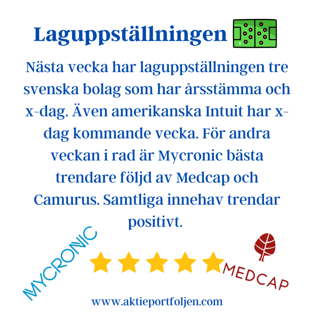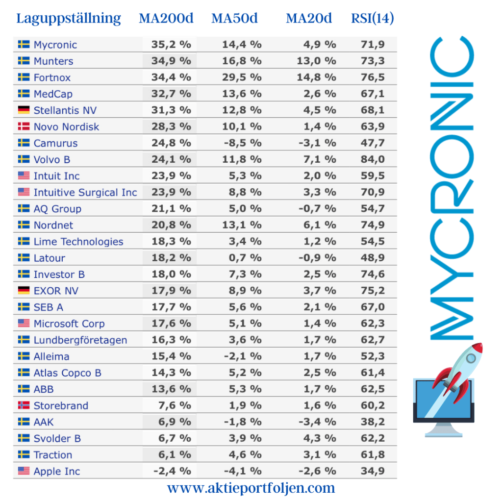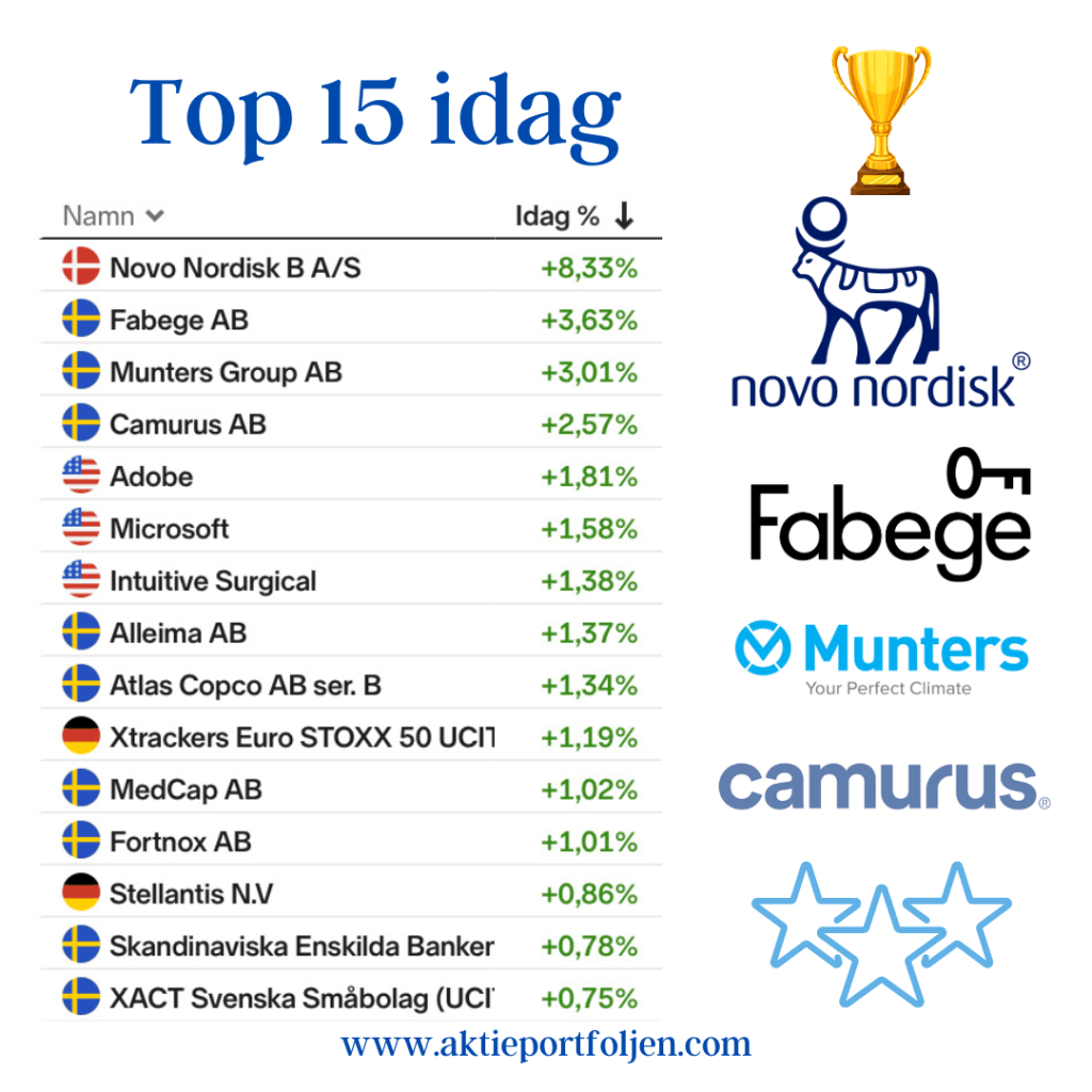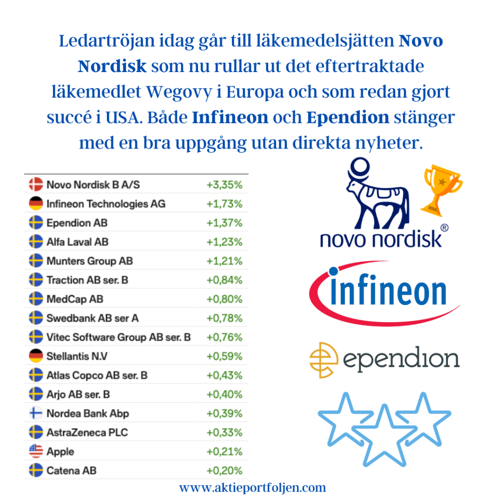 Dagens ledartröja gick till specialstålföretaget Alleima som fick stärktes av Handelsbankens köpstämpel på tre års sikt. Ett fokus på mer lönsamma och mindre konjunkturkänsliga segment gör att banken bedömer att Alleima kan växa snabbare än resten av marknaden. Igår tog jag position i läkemedelsjätten Astra Zeneca som tillhör dagens vinnare och som förväntas höja utdelningen vid stämman ikväll. Mönsterritarbolaget Mycronics aktie fick en puff uppåt av att bolaget erhållit en order på SLX-maskinritare värd 7-9 miljoner dollar. Fyra kom klimatkontrollbolaget Munters som steg på en höjd riktkurs från Kepler Cheuvreux och upprepad köprekommendation.