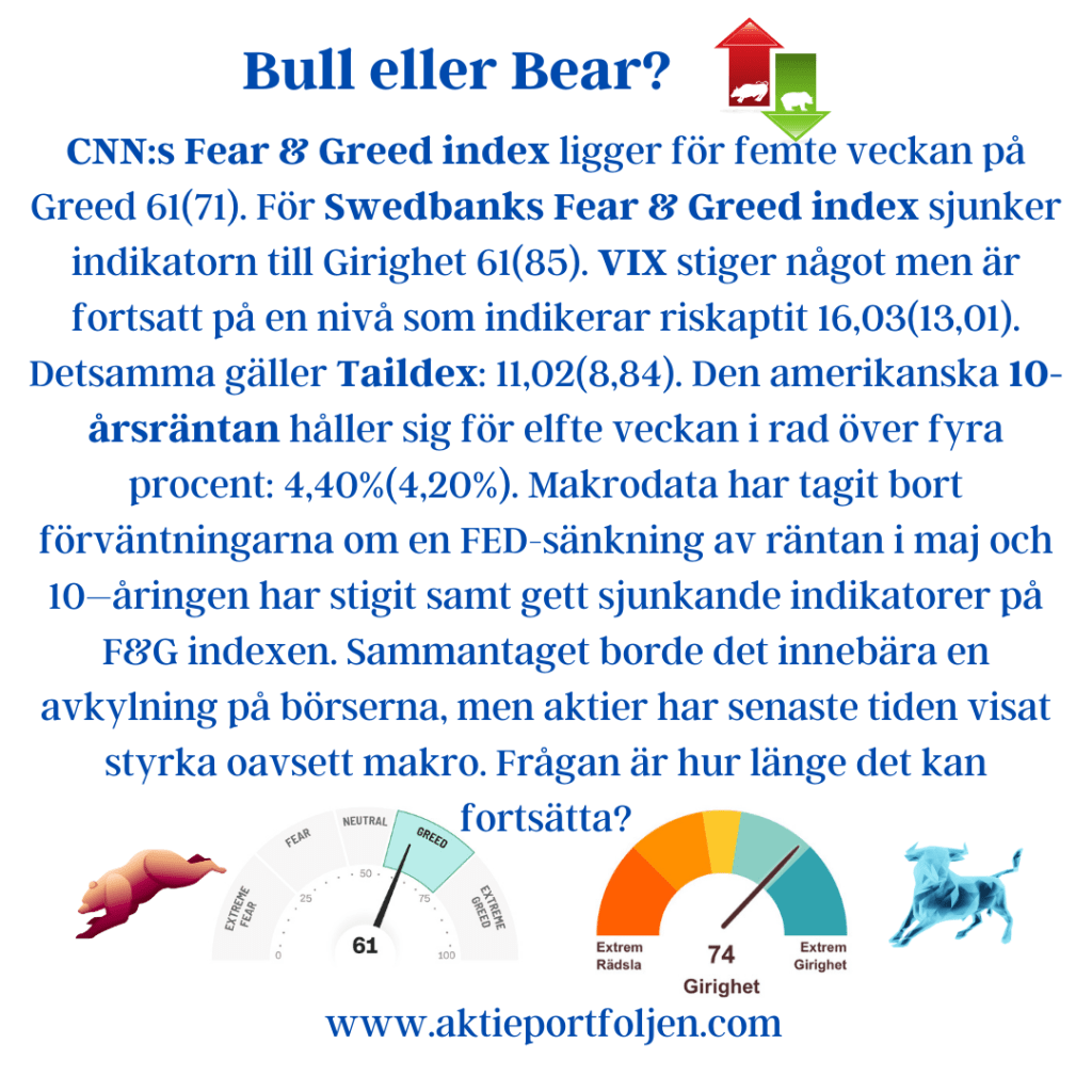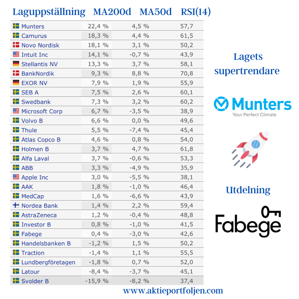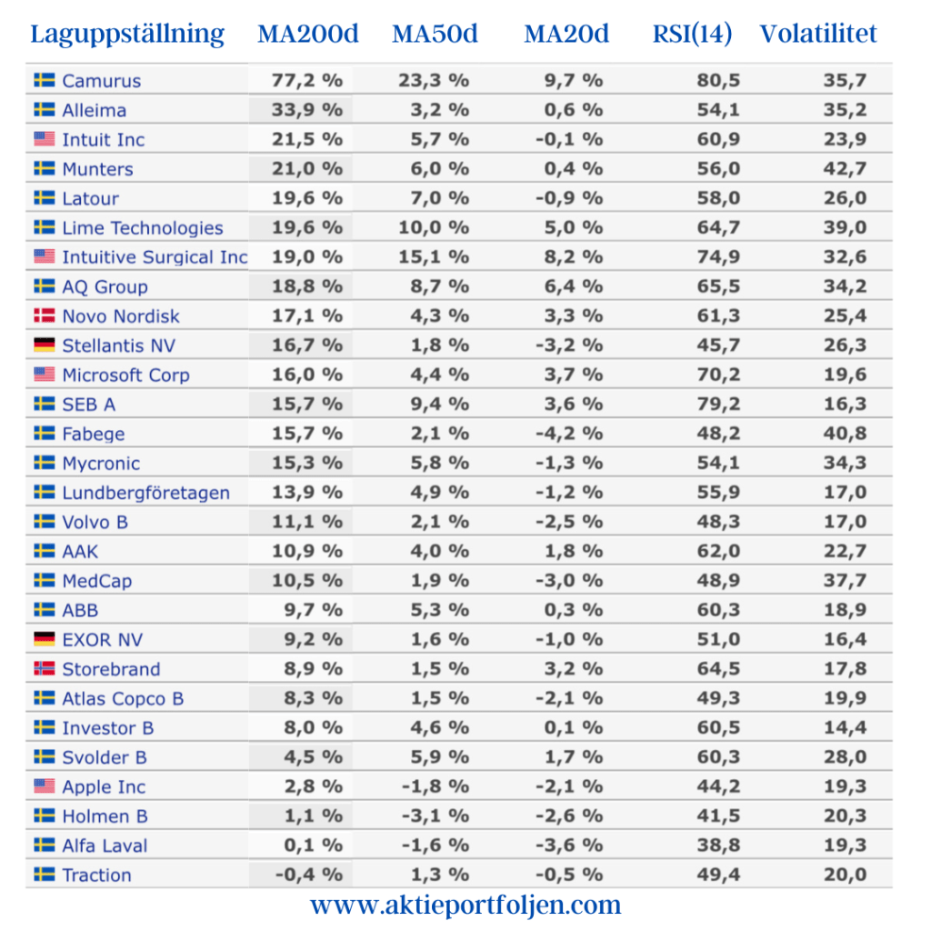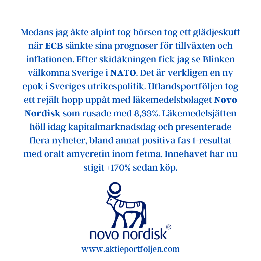 Dagens ledartröja gick till specialstålföretaget Alleima som fick stärktes av Handelsbankens köpstämpel på tre års sikt. Ett fokus på mer lönsamma och mindre konjunkturkänsliga segment gör att banken bedömer att Alleima kan växa snabbare än resten av marknaden. Igår tog jag position i läkemedelsjätten Astra Zeneca som tillhör dagens vinnare och som förväntas höja utdelningen vid stämman ikväll. Mönsterritarbolaget Mycronics aktie fick en puff uppåt av att bolaget erhållit en order på SLX-maskinritare värd 7-9 miljoner dollar. Fyra kom klimatkontrollbolaget Munters som steg på en höjd riktkurs från Kepler Cheuvreux och upprepad köprekommendation.