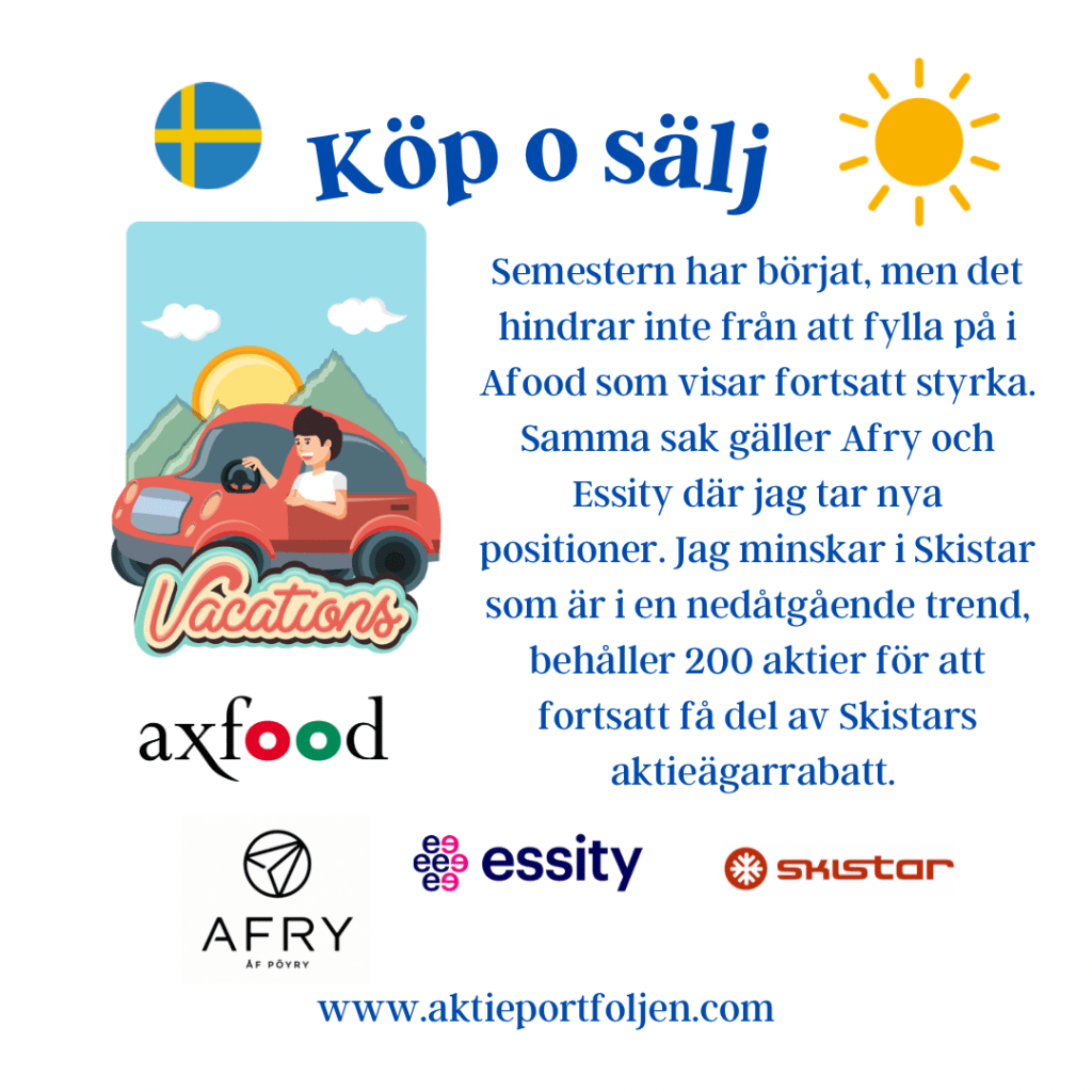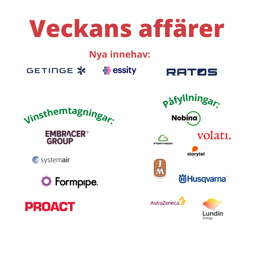 Cloetta +7,0 % ASSA ABLOY +1,9 % Telenor +1,3 % Essity +1,1 % Airbus +0,7 % Investor +0,6 % AstraZeneca +0,6 % Axfood +0,4 % XACT Obligation +0,1 % iShares € Govt Bond 3–7yr +0,04 %