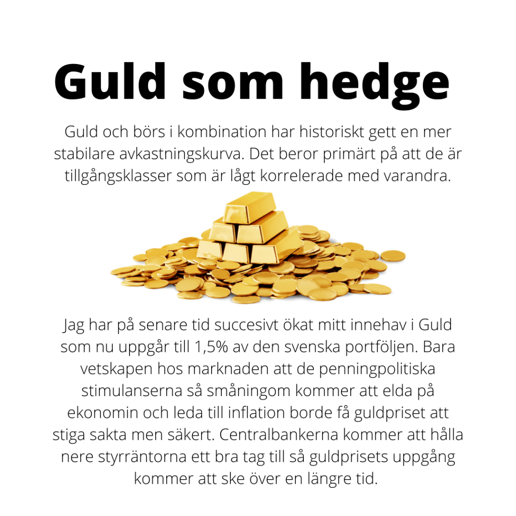 Under veckan har jag planenligt fyllt på min hedge med Guld och Silver ETF:er. Guld och börs i kombination har historiskt gett en mer stabilare avkastningskurva. Det beror primärt på att de är tillgångsklasser som är lågt korrelerade med varandra. Läs även mitt inlägg från den 28 juli där jag skriver om guld och silver som hedge.