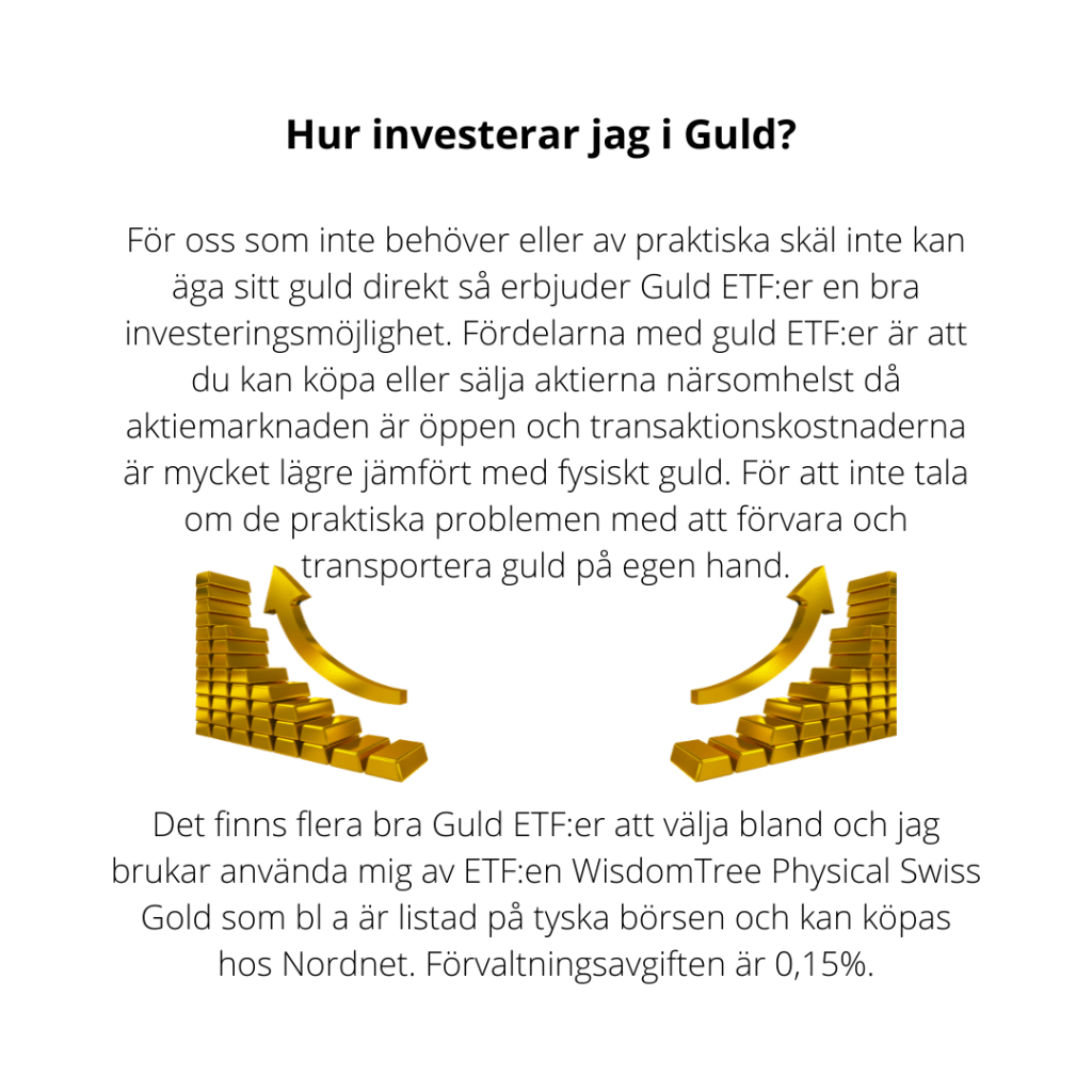 När börsen är skakig är det många investerare som letar alternativ. Personligen har jag aldrig ägt guld utan tänkt mer som Warren Buffett som säger att det ger inga intäkter, men efterhand som portföljerna växer har jag tänkt om och tänker att Guld och Silver kan vara en bra hedge till aktier och inflation.