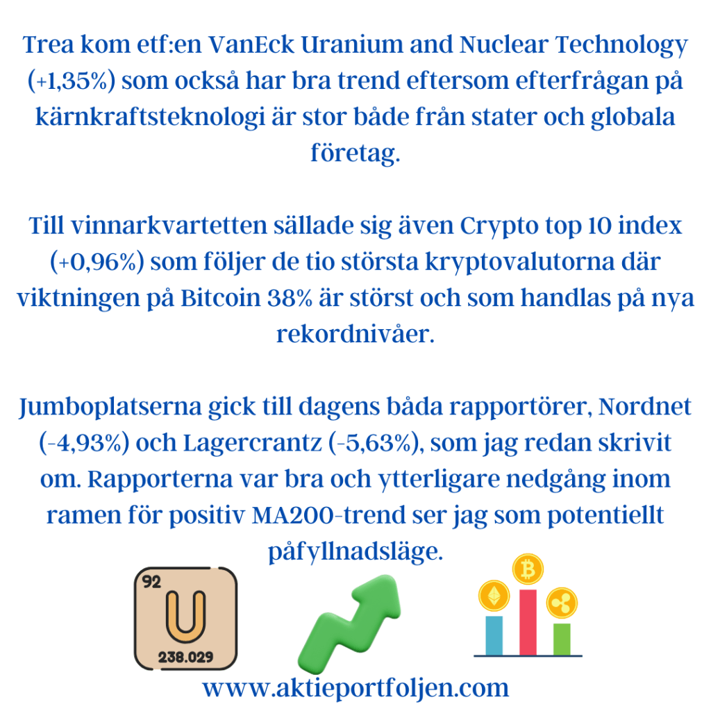 SaltX Technology B +1,47 % Storebrand +1,00 % Catena +0,35 % Global X European Infrastructure ETF +0,28 % flatexDEGIRO +0,25 % Svenska Handelsbanken A +0,23 % Karnov Group +0,18 % Axfood +0,15 % Spiltan Invest 0,00 % XACT Obligation ETF −0,06 % WisdomTree Physical Gold −0,18 % iShares € Govt Bond 3–7yr ETF −0,19 % AstraZeneca −0,21 % Asker Healthcare −0,31 % Investor B −0,33 %