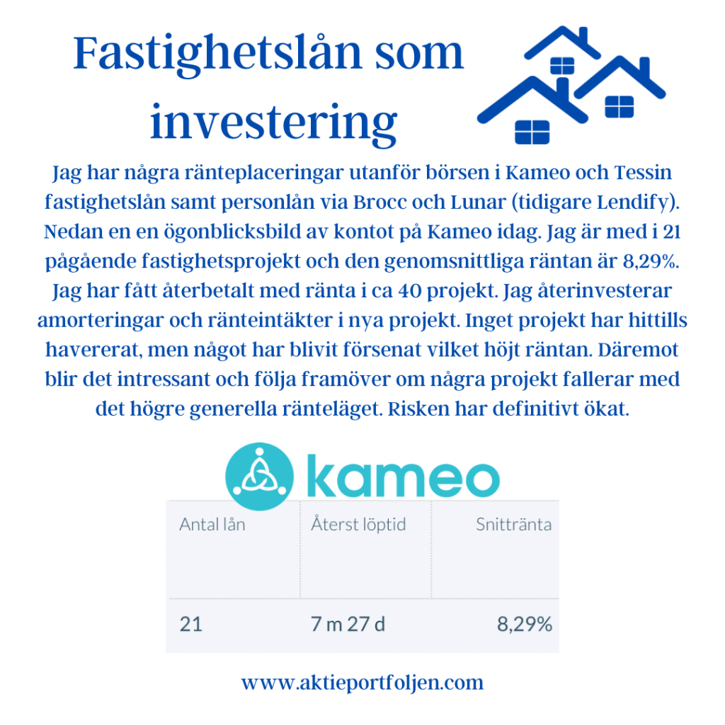 Jag har några ränteplaceringar utanför börsen i Kameo och Tessin fastighetslån samt personlån via Brocc och Lunar (tidigare Lendify). Nedan en en ögonblicksbild av kontot på Kameo idag. Jag är med i 21 pågående fastighetsprojekt och den genomsnittliga räntan är 8,29%. Jag har fått återbetalt med ränta i ca 40 projekt. Jag återinvesterar amorteringar och ränteintäkter i nya projekt. Inget projekt har hittills havererat, men något har blivit försenat vilket höjt räntan. Däremot blir det intressant och följa framöver om några projekt fallerar med det högre generella ränteläget. Risken har definitivt ökat.