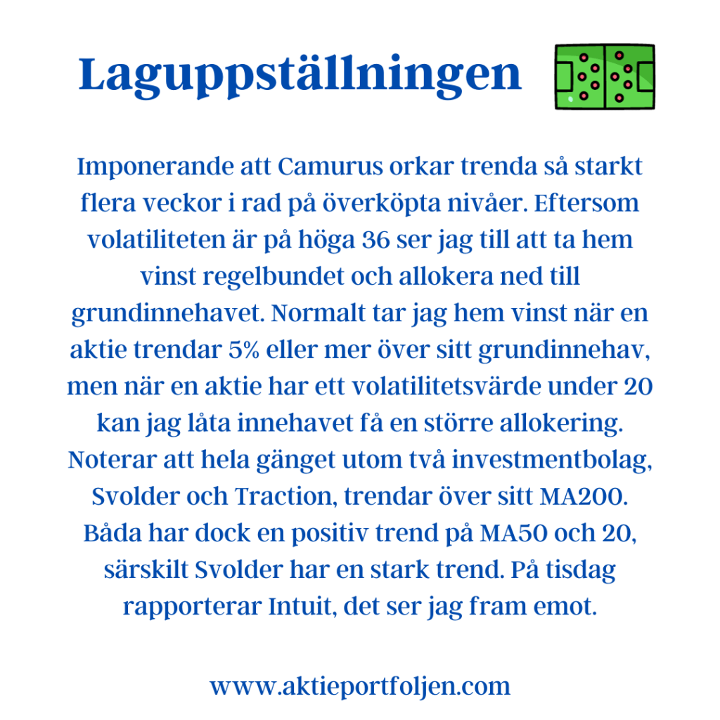 Vår laguppställning lever i stort sett upp till regelbokens krav, med positiva trender på MA200 för nästan alla bolag, med undantag för investmentbolagen. Det mest spännande är att lagets outsider, greentechbolaget SaltX, toppar listan med den bästa trenden på MA200. Trots att bolaget inte uppfyller våra fundamentala krav på vinst, är det inne i en avgörande kommersialiseringsfas. Tekniken de utvecklat, som kan eliminera CO2-utsläpp vid cement- och kalkproduktion, är bekräftad och har bidragit till en hisnande uppgång på 154% i år.