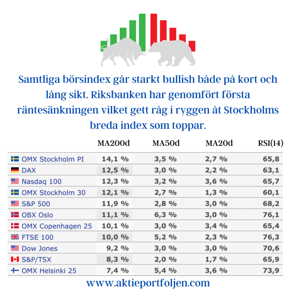 Augusti är historiskt sett en svag börsmånad, ofta präglad av lägre volymer och ökad volatilitet. Trots detta har månaden startat starkt med positiva trender på samtliga börsindex. Enda undantaget är Köpenhamnsbörsen, som avviker med en negativ trend på MA200. Denna utveckling kan i stor utsträckning förklaras av Novo Nordisk, vars rörelser haft en betydande inverkan på indexet då bolaget utgör en så pass stor del av den danska börsen.